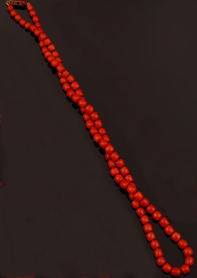 Graduated coral beads necklace with gold and enamel clasp
