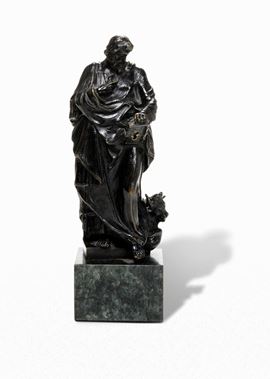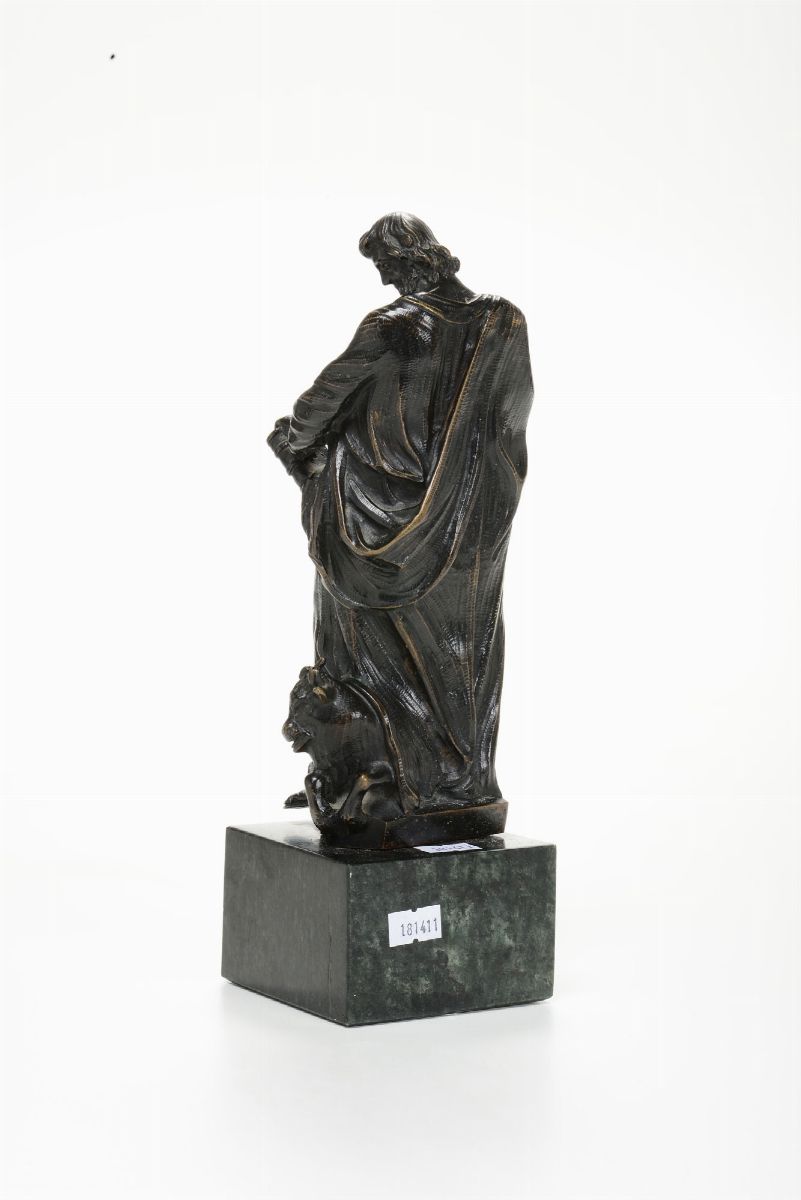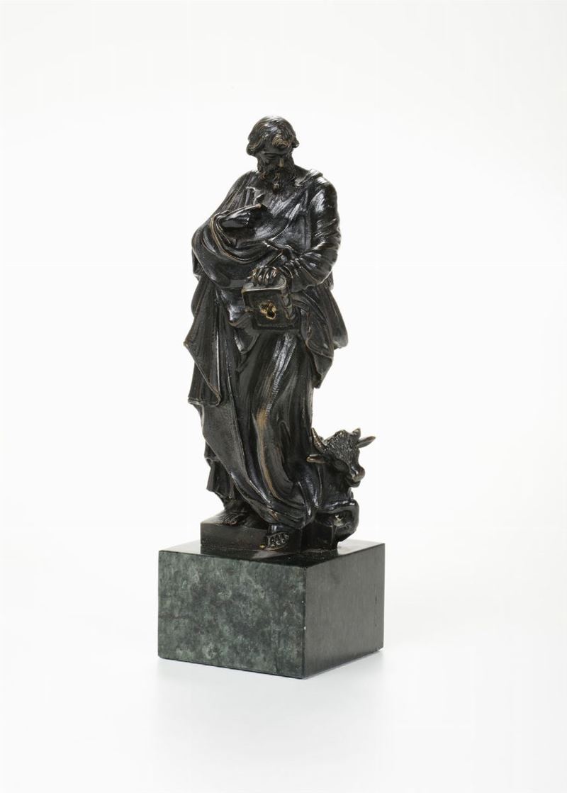 A Saint Matthew the Evangelist in molten and chiselled bronze on a marble base (non-coeval). Baroque artist in Rome (?), 17th-18th century. H 23cm, with base 28cm
