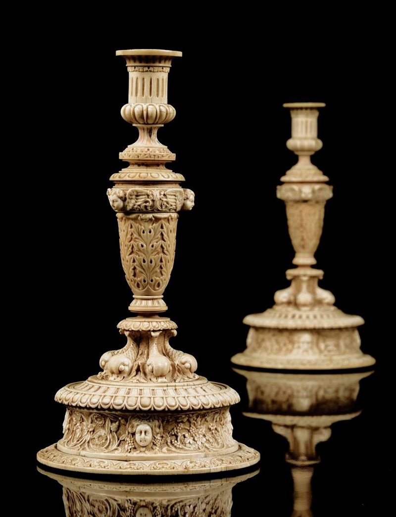 A pair of elaborate ivory candleholders, finely carved in floral, naturalistic and human motives. France, Dieppe (?), 19th century. H 28cm, diameter 15cm