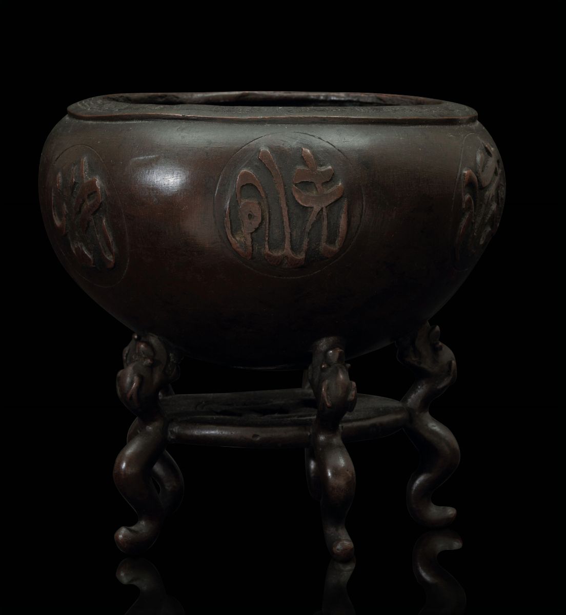 Round bronze censer on dragon head-shaped stands with an embossed Arab inscription. Marked. 18x20.5cm