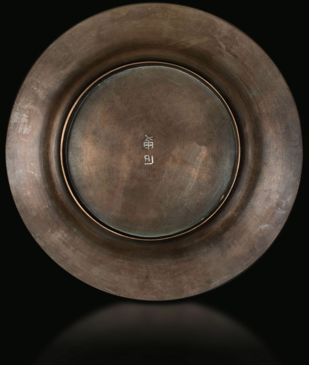 Early 19th century. A bronze plate with a dragon surrounded by silver naturalistic elements. Marked. Diam. 27.5cm