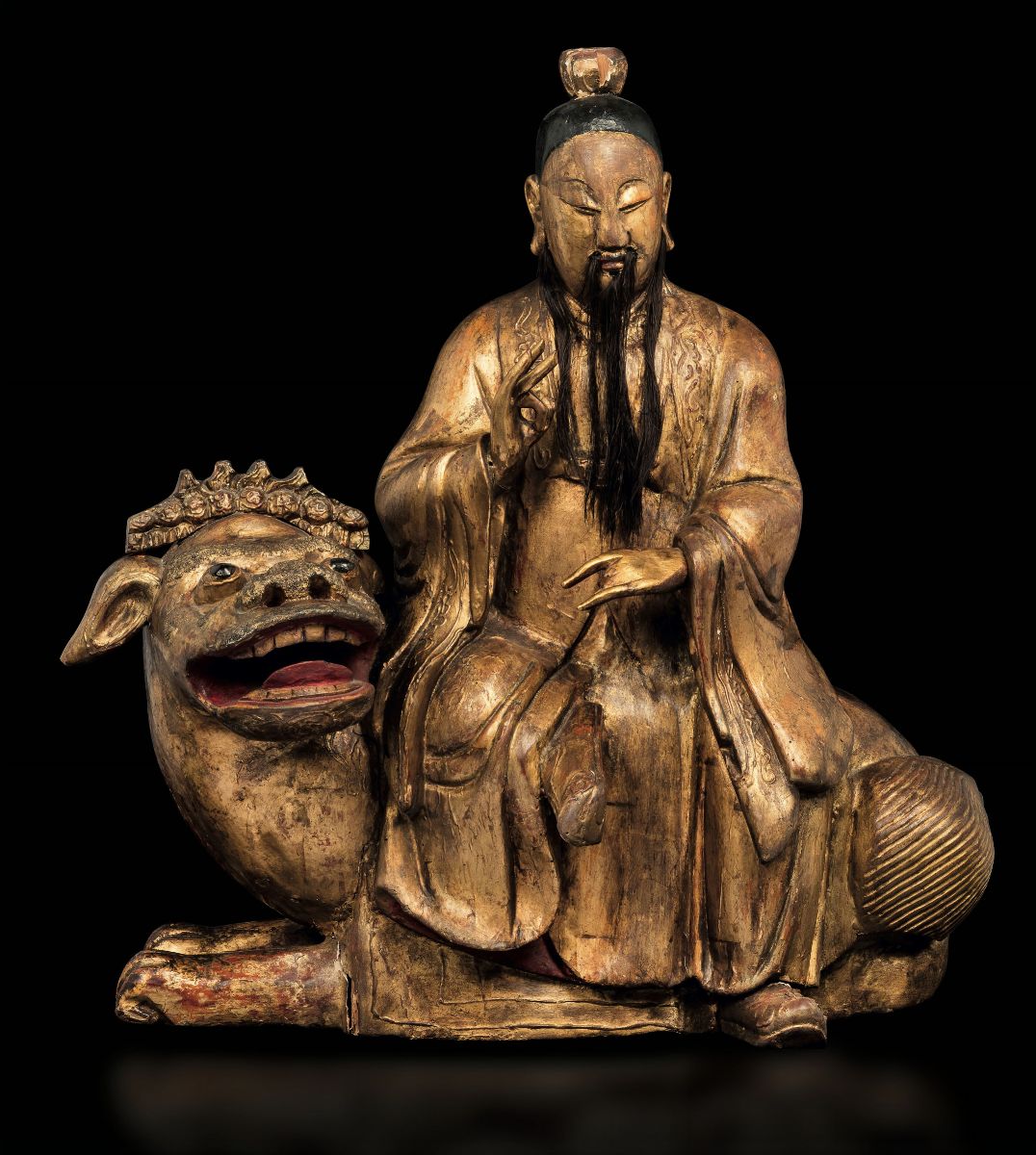 18th century. Gilt and lacquered wood, a wiseman seated on a Pho dog. 48x42.5cm