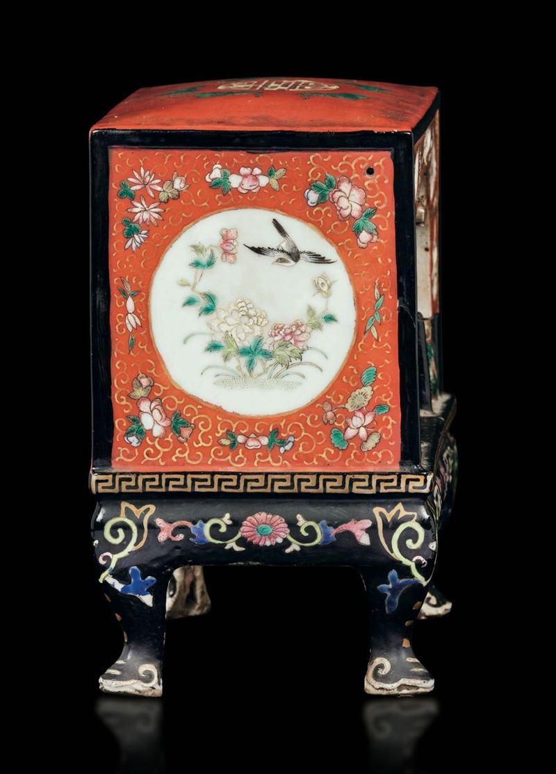 A rare miniature of a bed in polychrome enamelled Pink Family porcelain, naturalistic decors within reserves and floral motives, from the Jiaqing period of the Qing Dynasty (1796-1820). 17.5x16.6x10.5cm