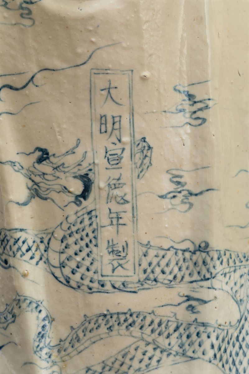 White and blue porcelain depicting a character with a horse head. Apocryphal Xuande mark. H 76cm