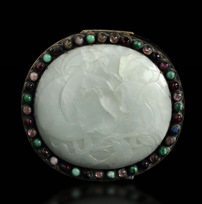 An oval silver box with semi-precious stone inlays and a white jade plaque decorated with naturalistic motifs. 13x12x6cm
