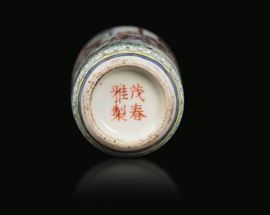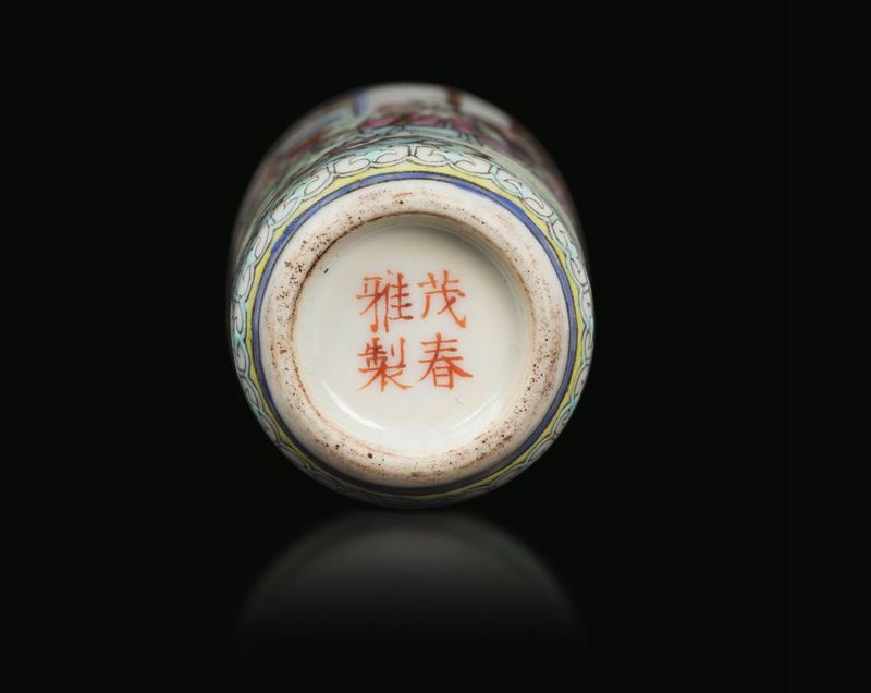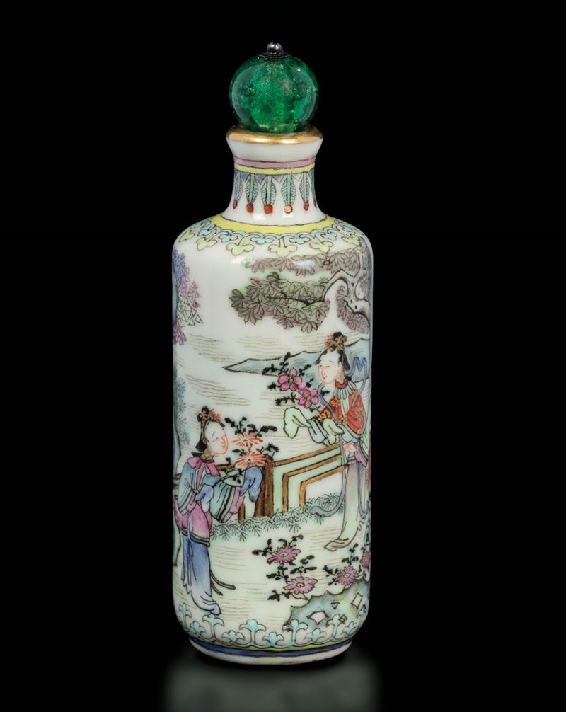 A Pink Family porcelain snuff bottle with a polychrome enamel decor of figures of courtesans within a landscape. Maochun Yazhi mark. H 8cm