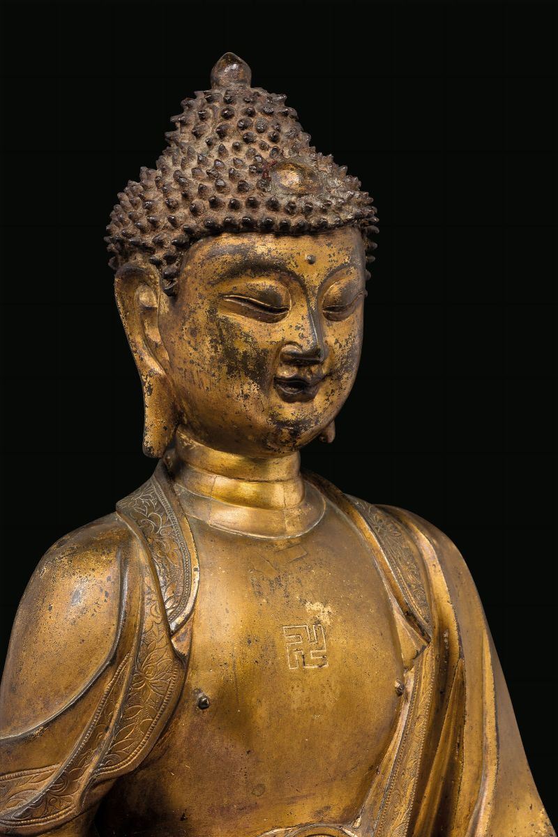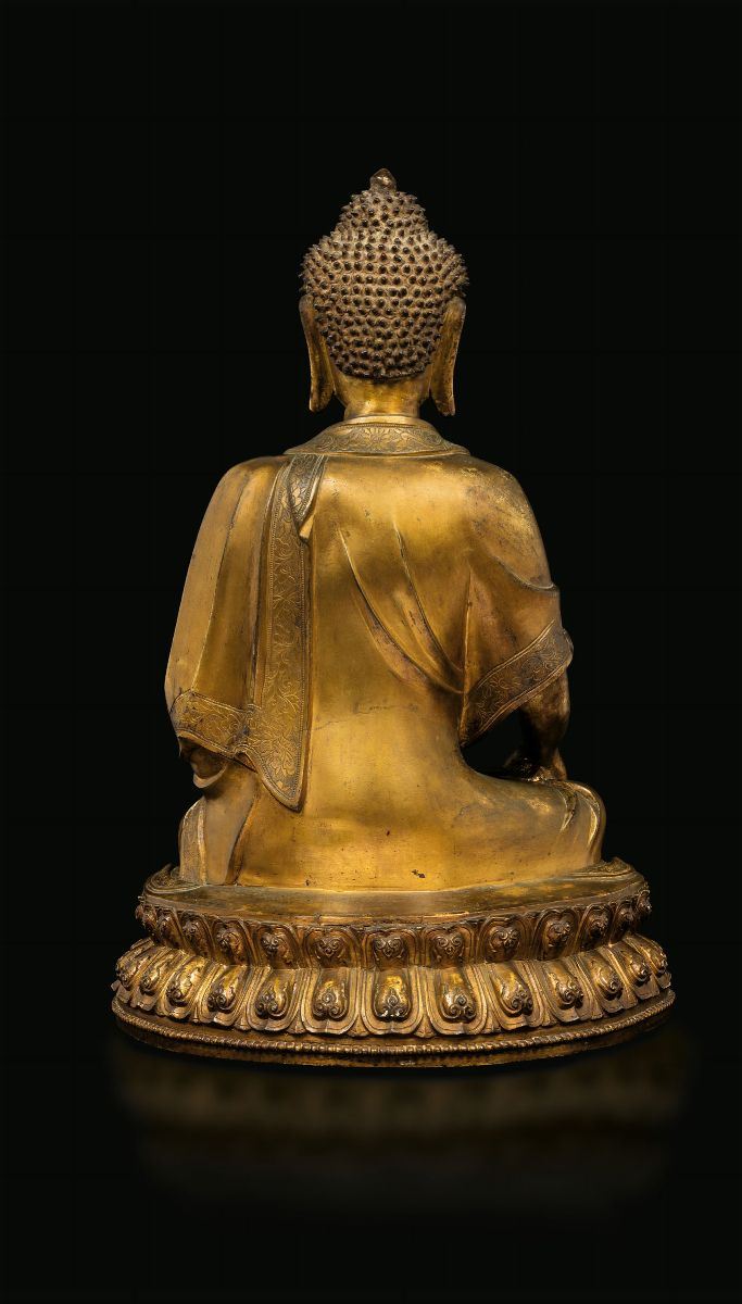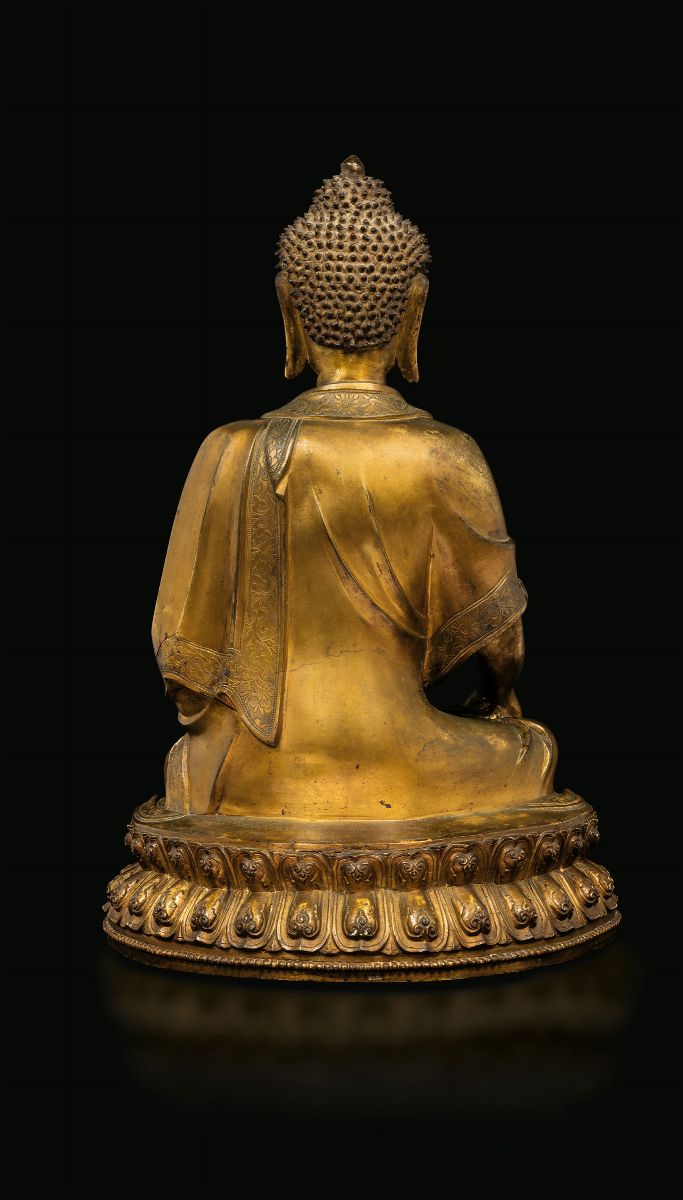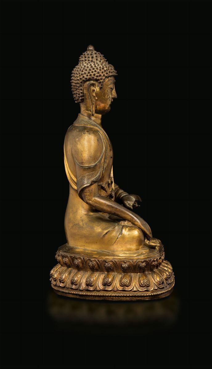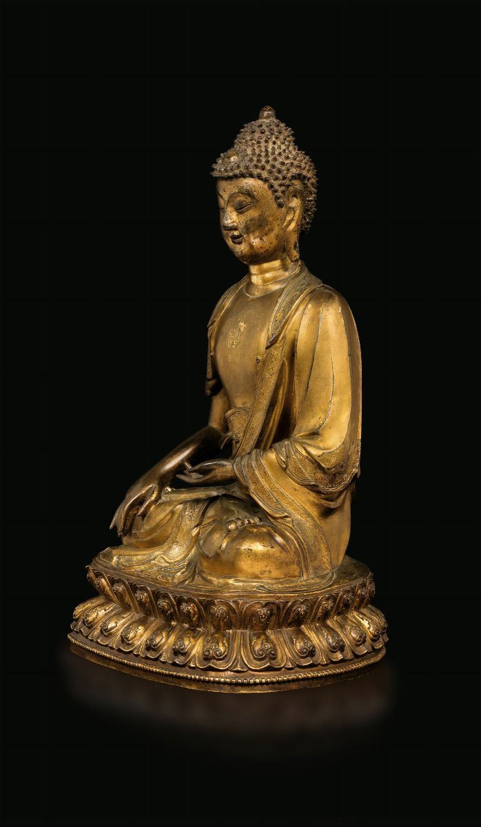 A large and magnificent gilt bronze figure of Buddha Sakyamuni, in dhyanasana above a base surrounded by two rows of elaborate lotus flowers. 15th-16th century. H 41.5cm
