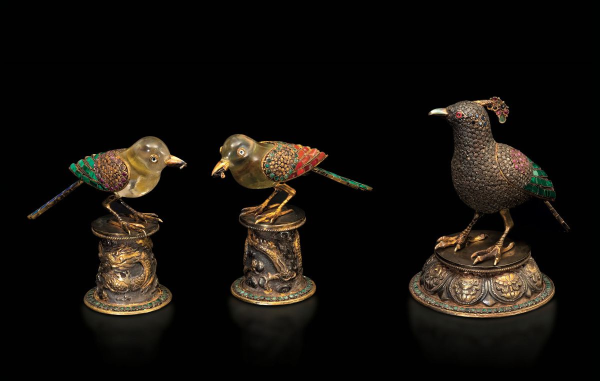 A lot of three carved rock crystal figures in the shape of birds, silver-mounted with semi-precious stone and enamel inlays. H from 11cm to 13cm