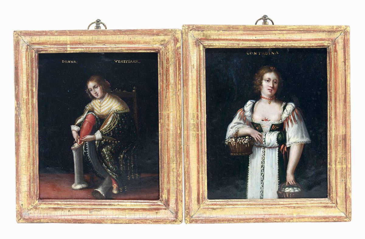 I due rami dipinti rappresentanti Contadina e Donna veneziana si identificano con la tipica ritrattistica della raffinata produzione di Gerolamo Forabosco (Padova 1605-1679).