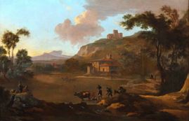 Jan Sonjè (1625-1707) Paesaggio italianeggiante con figure e animali