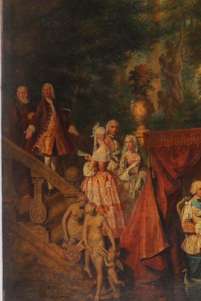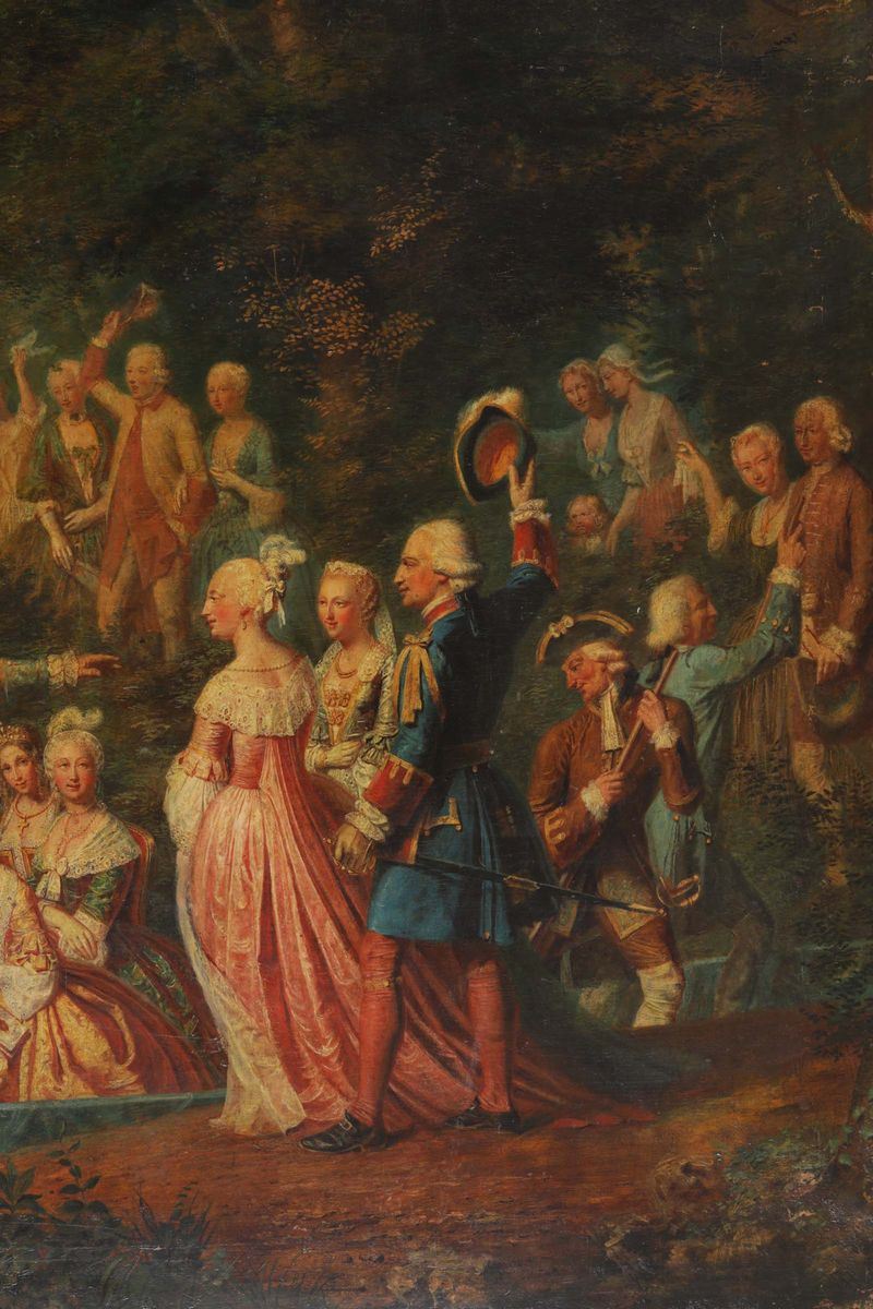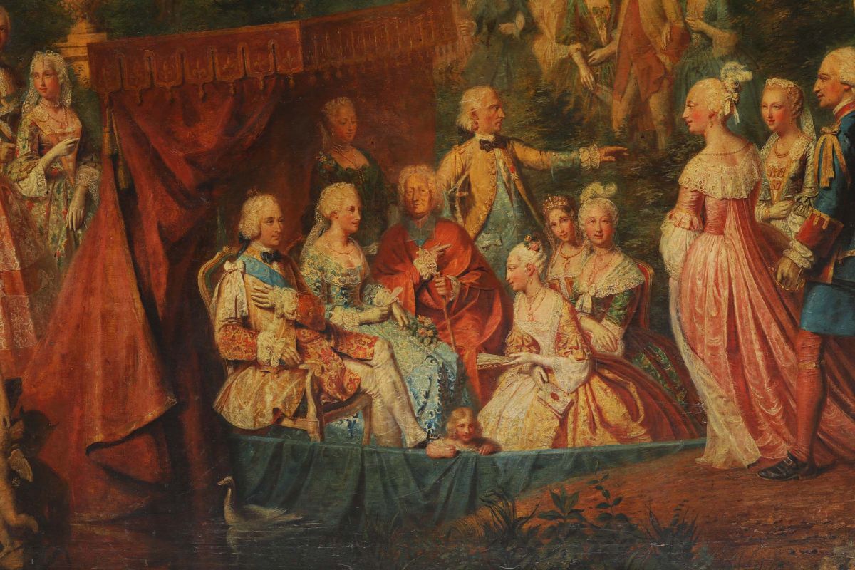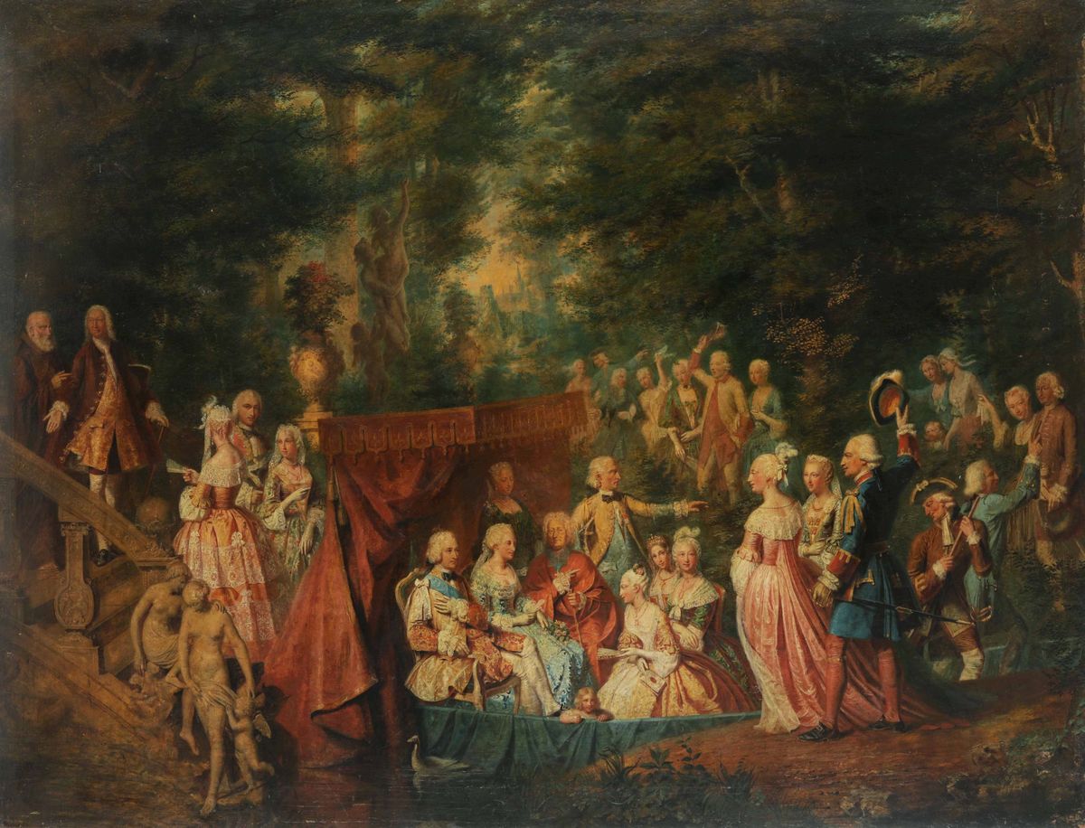 Sposi della Casa Reale di Francia (Luigi Ferdinando di Borbone e Maria Giuseppina di Sassonia?) accolti in una tenuta nobiliare di campagna