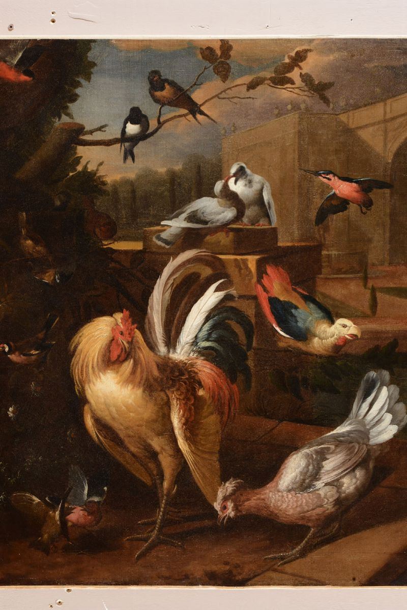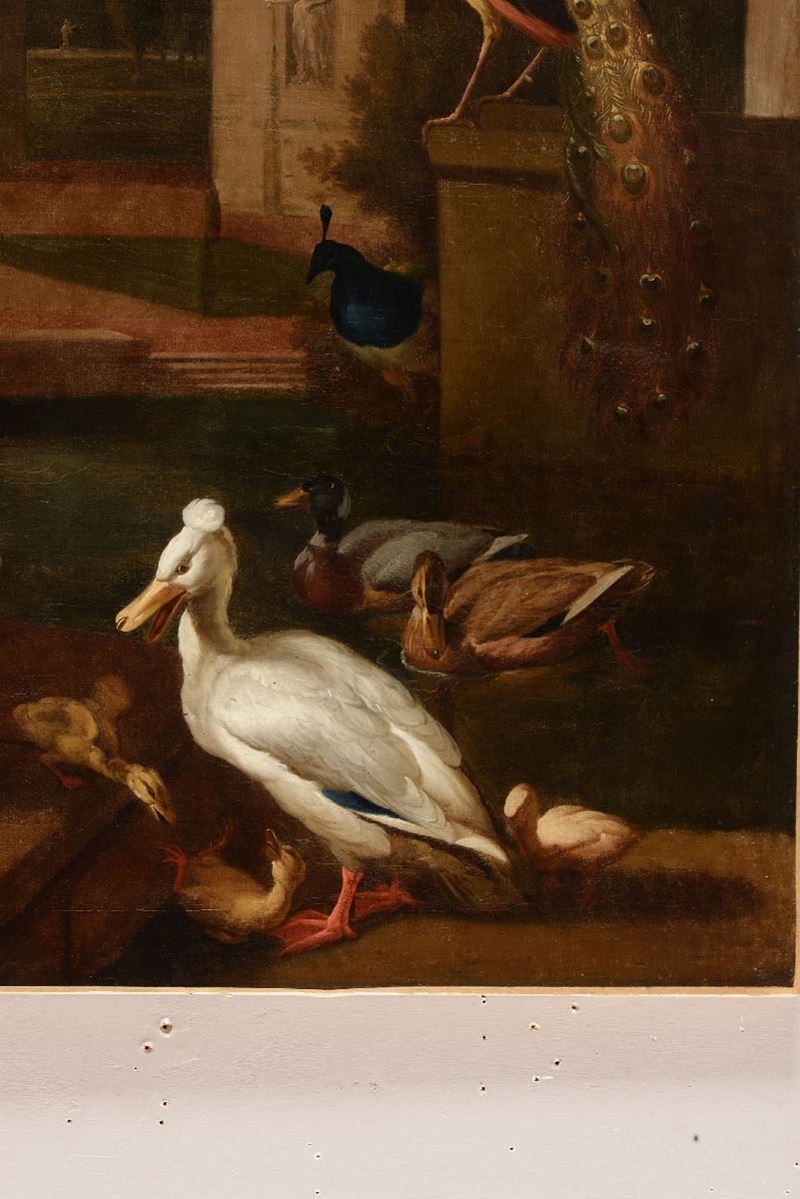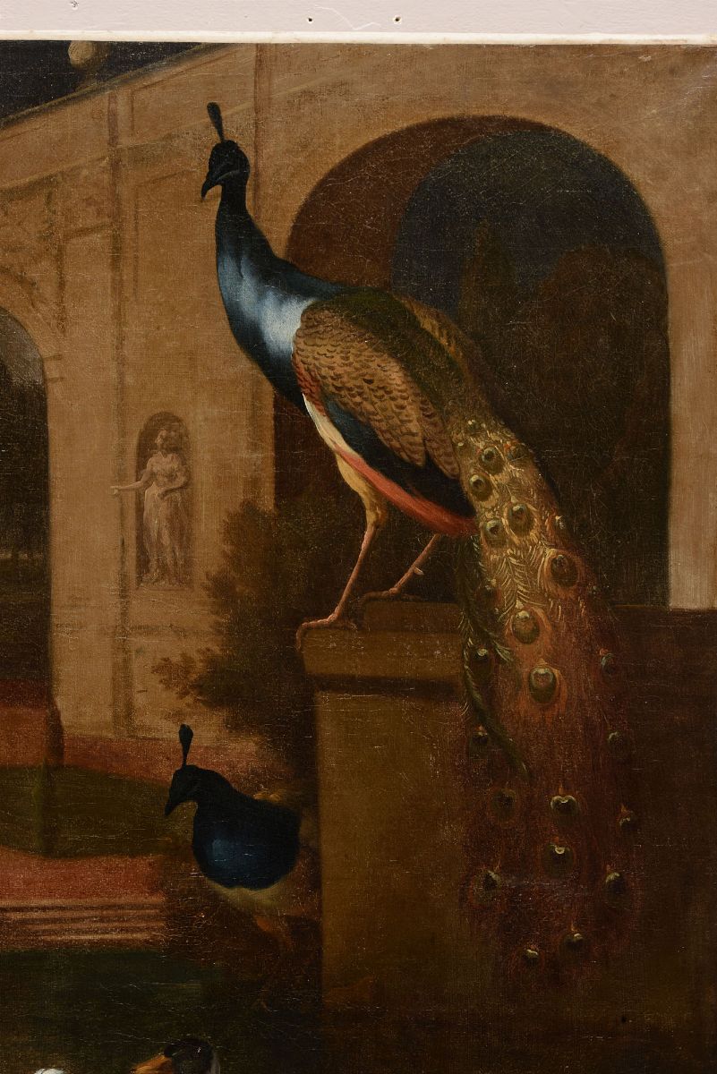 Scuola fiamminga del XVII-XVIII secolo Scorcio architettonico con volatili