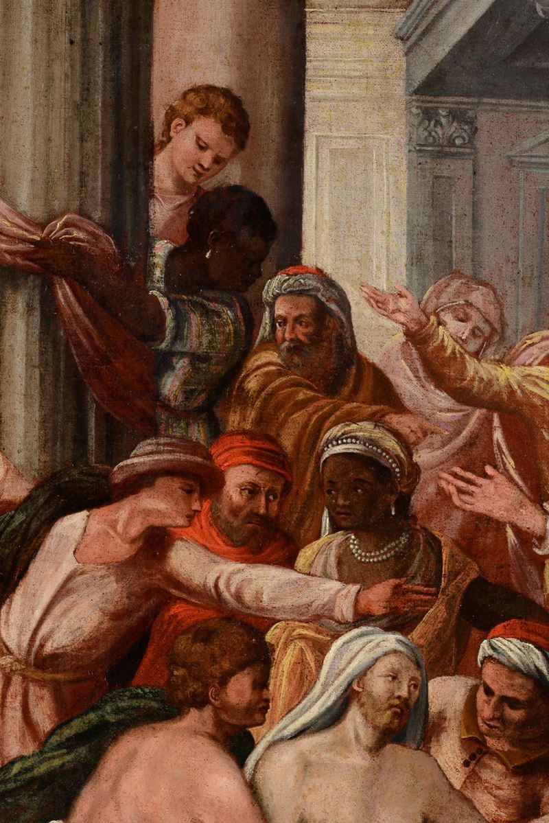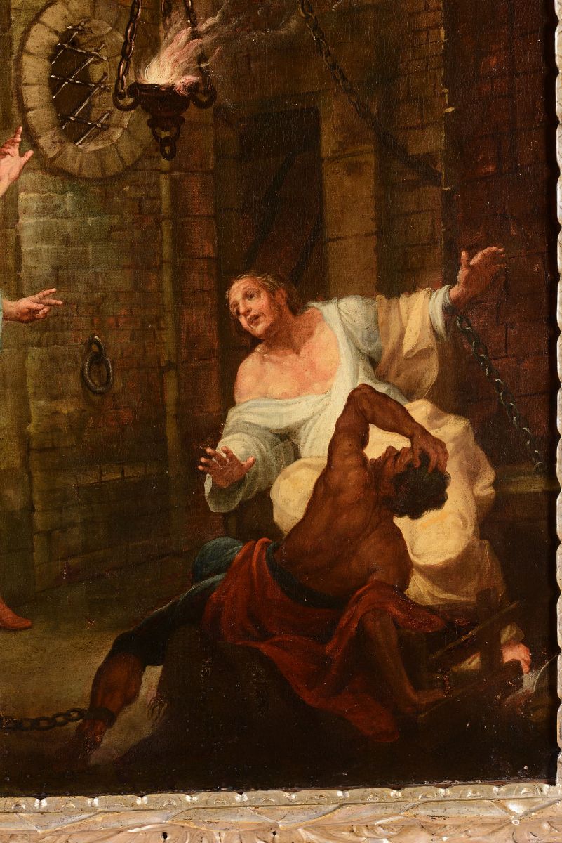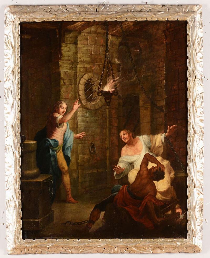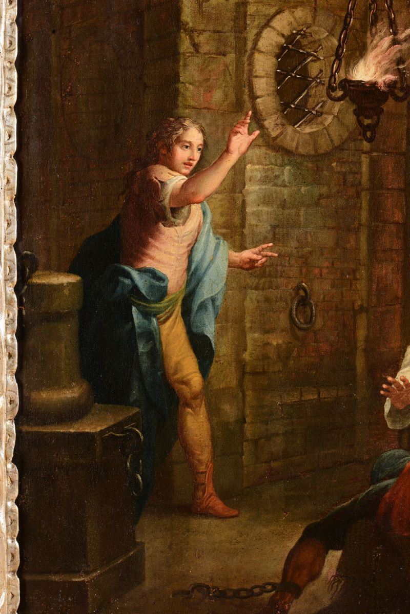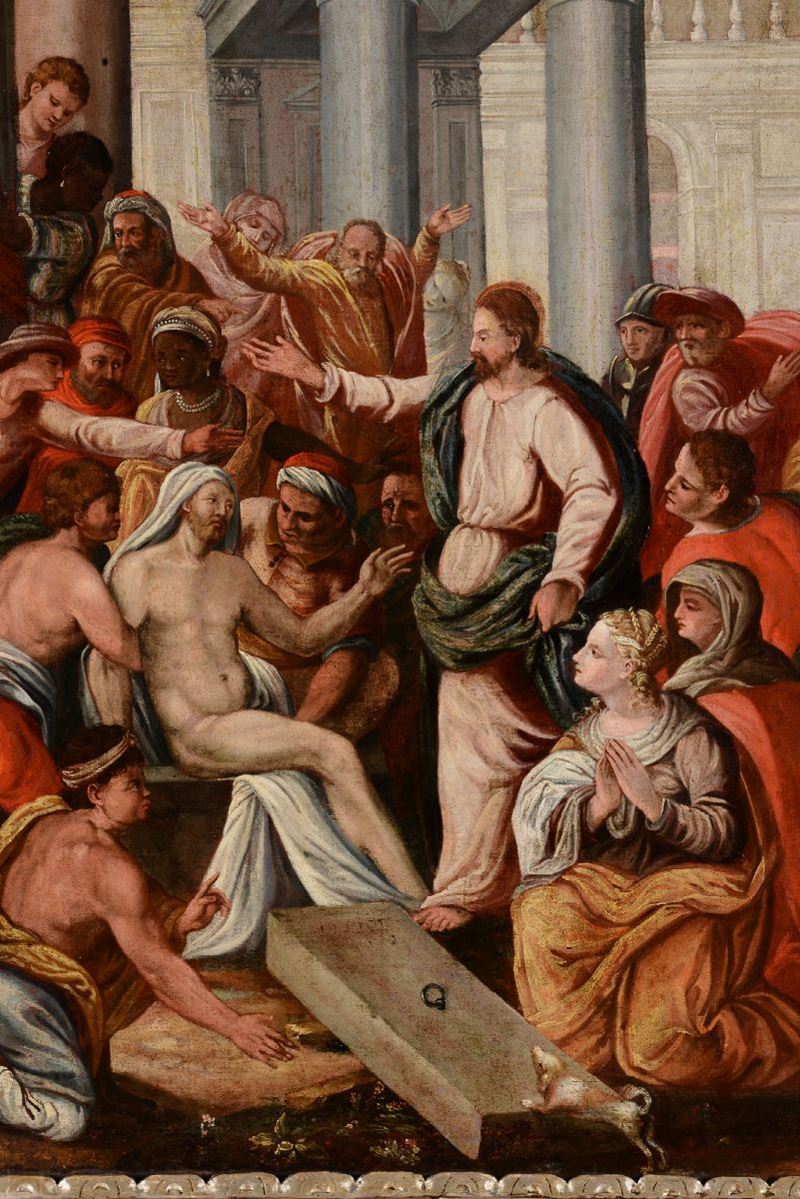 Scuola veneta del XVII secolo Coppia di dipinti raffiguranti Resurrezione di Lazzaro e Interno di carcere