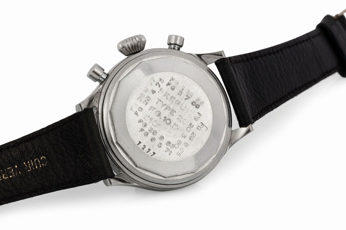 Fine and very rare, water-resistant, stainless steel aviator's wristwatch with round button fly-back chronograph and register. Made circa 1950