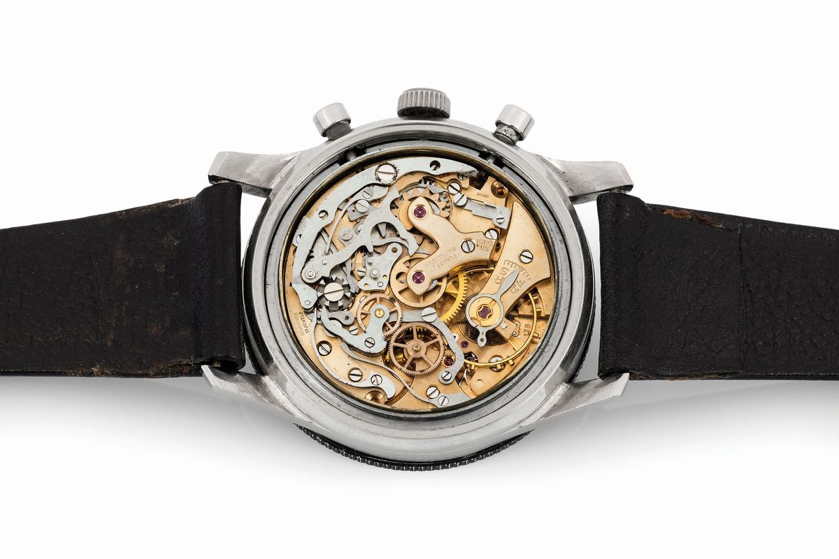 Case No. 1141159, Ref. 765 CP. Fine and very rare water-resistant, stainless steel wristwatch with round button chronograph, registers and revolving bezel. Made circa 1969.