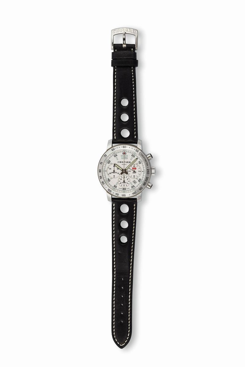 Case No. 971051, Ref. 8932. Made in 2003 for the Brescia - Rome - Brescia classic car race. Fine, water-resistant, self-winding, stainless steel wristwatch with rubber-coated round button chronograph, registers, tachometer bezel, date and a stainless steel Chopard buckle. Accompanied by the original box and booklet