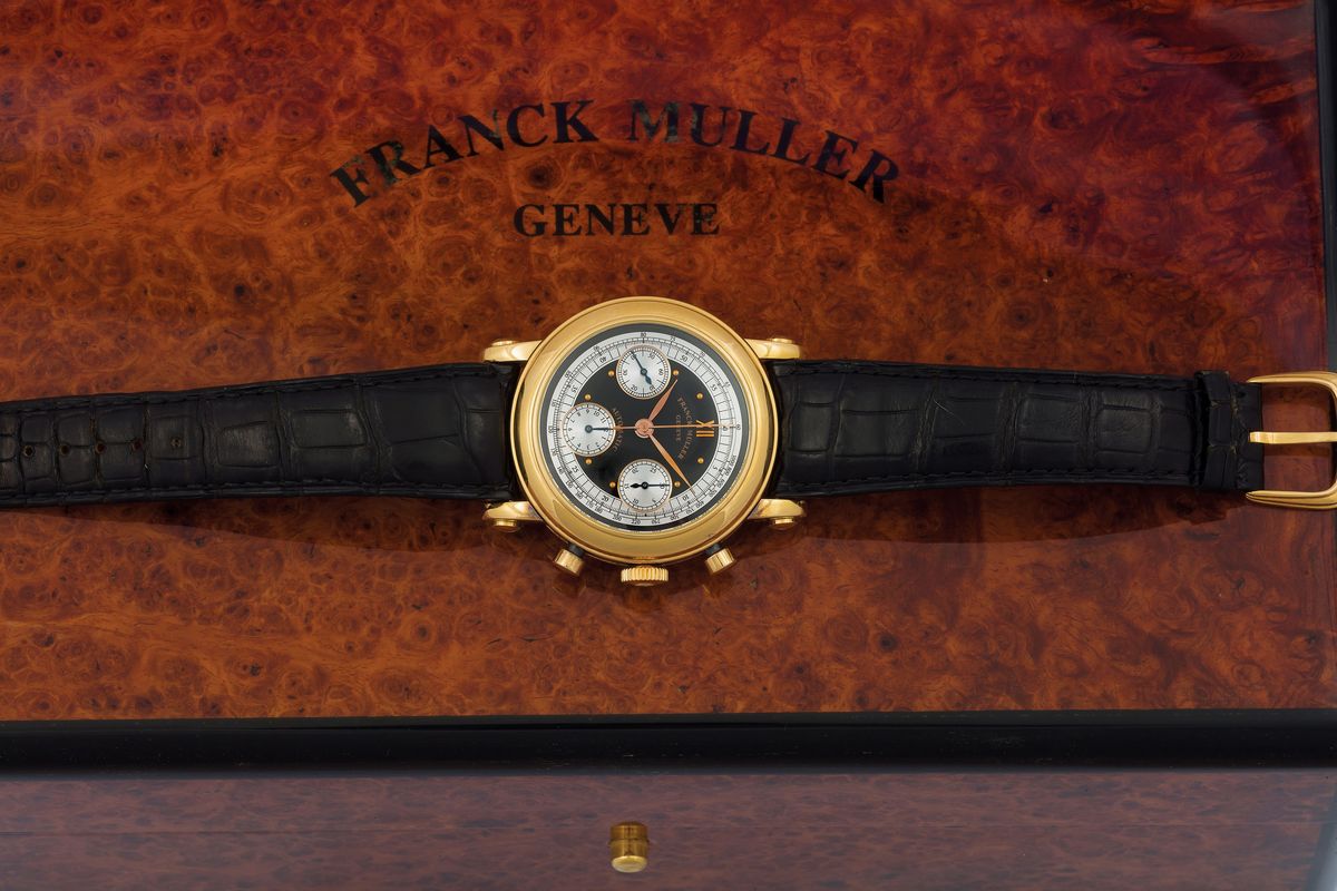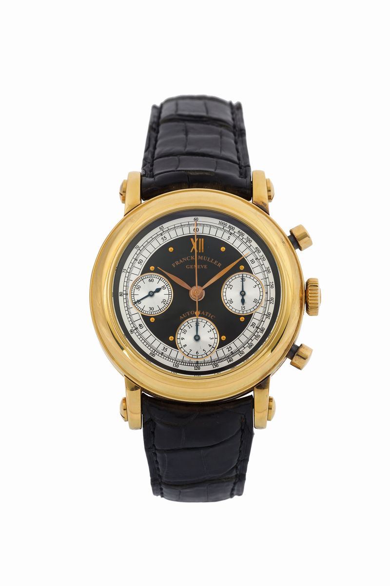 Master of Complications, Chronograph Automatic, No. 24, Ref. 7000 CC . Very fine, 18K yellow gold, self-winding wristwatch with round-button chronograph, registers, tachometer and a yellow gold Franck Muller buckle. Accompanied by the original box and Certificate. Sold in 1995