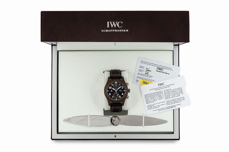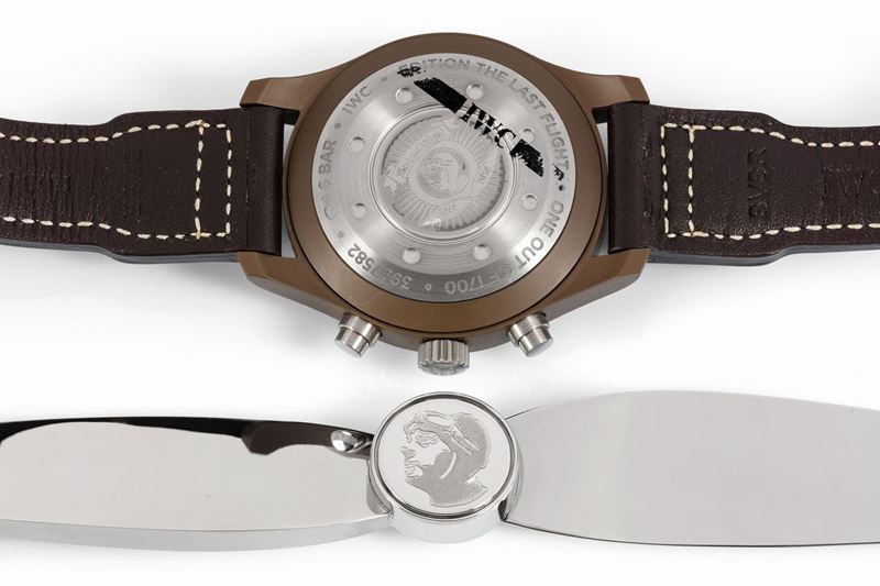 Saint Exupery, The Last Flight, case No. 3997582, Ref.IW388004 . Fine, self-winding, water-resistant, brown ceramic and titanium wristwatch with date, round button chronograph, register and titanium IWC buckle. Accompanied by the original Box and Guarantee. Sold in 2017. made in a limited edition of 1700 pieces in 2014.