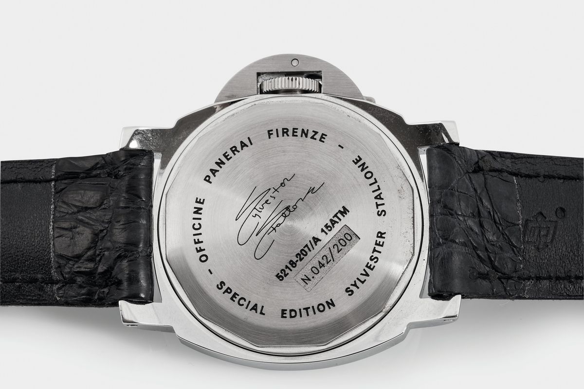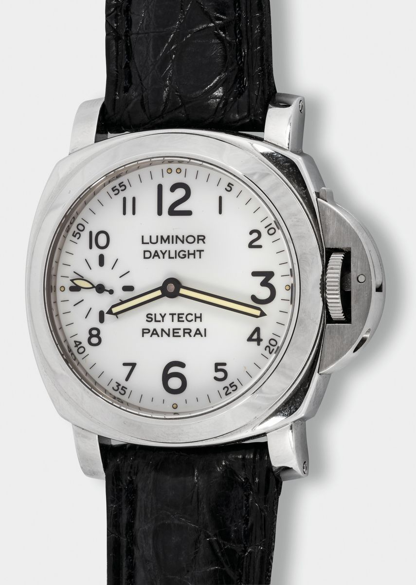 Luminor Daylight - Slytech Panerai, No 042/200, Ref. 5218-207/A. Fine, large and rare, water-resistant, stainless steel military- type diver's wristwatch with a large stainless steel Panerai buckle. Accompanied by the original box containing 3 extra straps with buckles,Guarantee, screwdiver, siluro and Panerai book. Made in a limited edition of 200 examples in 1995 in collaboration with Sylvester Stallone