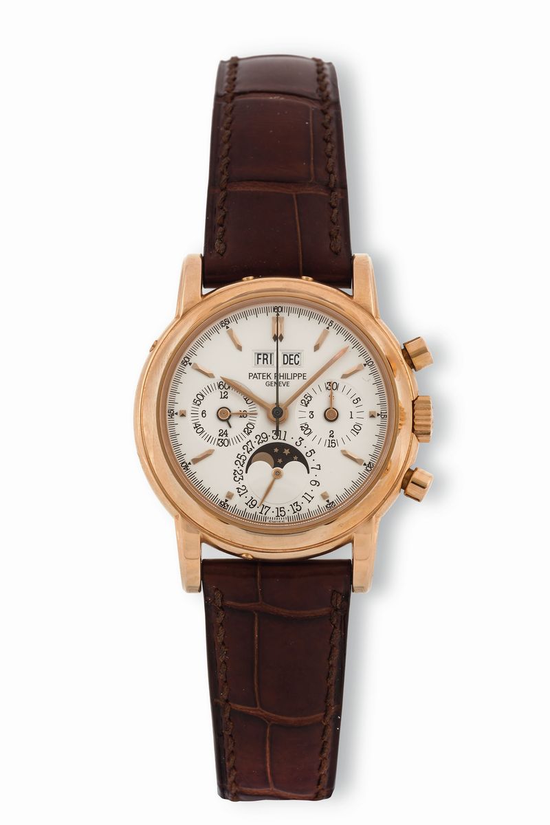 Ref. 3970E, movement No. 3046777. Very fine and rare, astronomic, water-resistant, 18K pink gold wristwatch with round button chronograph, register, perpetual calendar and moon phases and original deployant clasp. Accompanied by the original box. Made circa 1990.