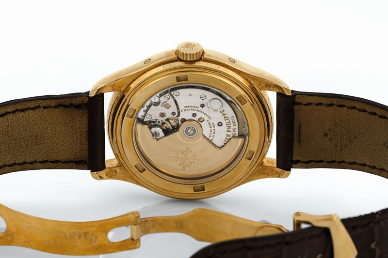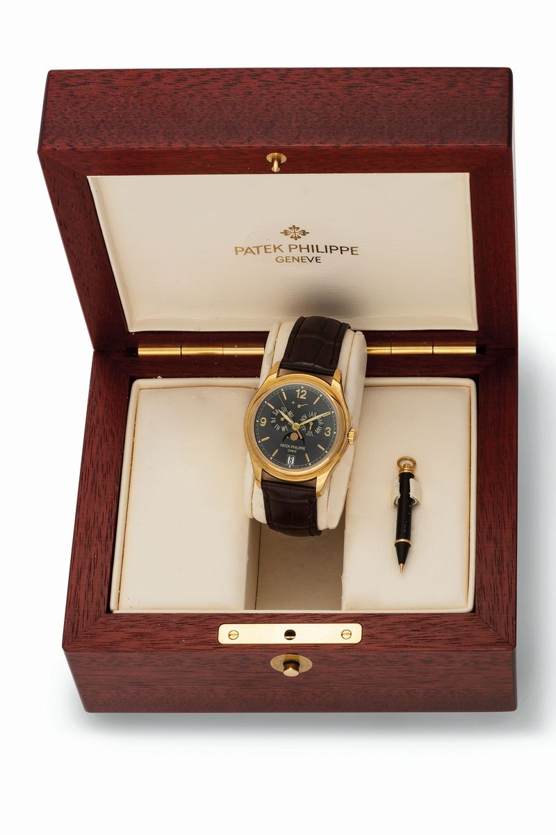 Movement No. 3556043, case No. 4307273, Ref. 5146J. Very fine, center seconds, self-winding, water-resistant, annual calendar, 18K yellow gold wristwatch with annual calendar, moon phases, power reserve indication and a platinum Patek Philippe deployant clasp. Accompanied by the Certificate of Origin, original fitted box, instruction booklet.