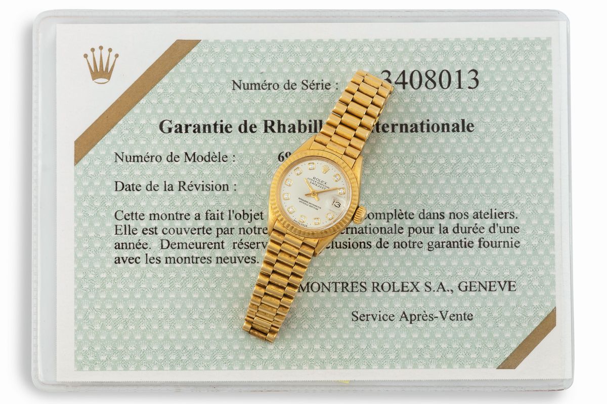 Oyster Perpetual, Datejust, Superlative Chronometer, Officially Certified, case No. 3408013, Ref. 6917/8. Fine, center seconds, self-winding, water resistant, 18K yellow gold and diamonds lady's wristwatch with date, on an 18K yellow gold Rolex President bracelet with deployant clasp. Accompanied by extra links, box and Rolex overhaul Guarantee. made circa 1970