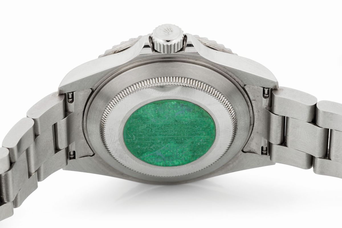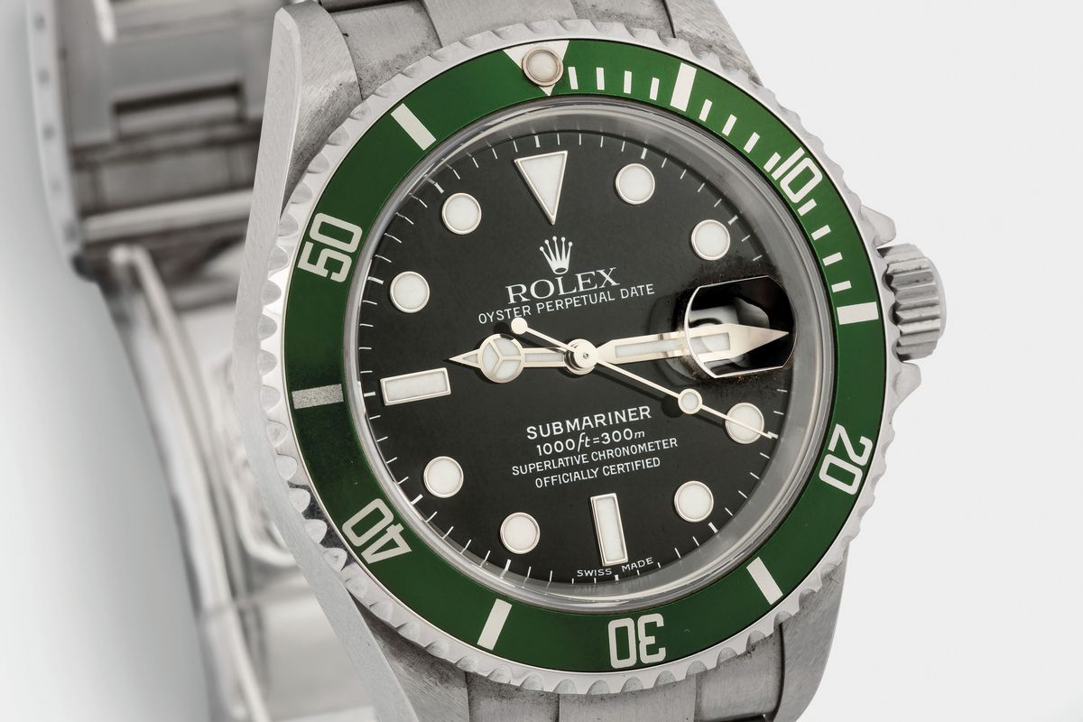Oyster Perpetual Date, Submariner, 1000 ft./ 300m, Superlative Chronometer Officially Certified, Ref. 16610LV. Fine, center seconds, self-winding, water resistant stainless steel diver's wristwatch with green bezel, date and a stainless steel Rolex Oyster Fliplock bracelet Ref. 93250.Launched in 2003 for the 50th Anniversary of the Rolex Submariner.
