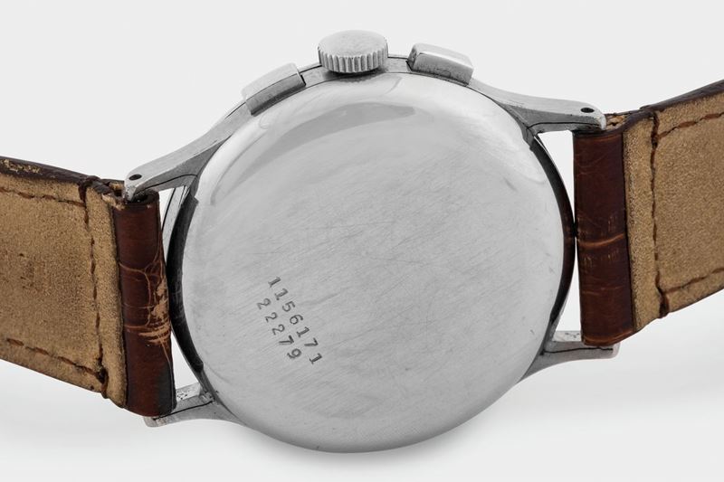 No. 1156171, Ref. 22279. Fine and rare, astronomic, stainless steel, water-resistant wristwatch with square button chronograph, registers, tachometer, triple date and moon phases. Made in the 1960s.
