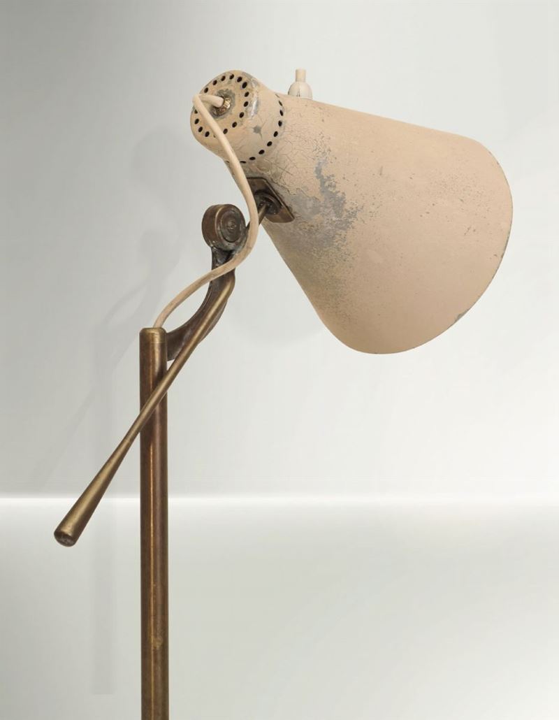 A mod. 1030 adjustable floor lamp with a brass structure. Marble base and lacquered aluminum diffuser.