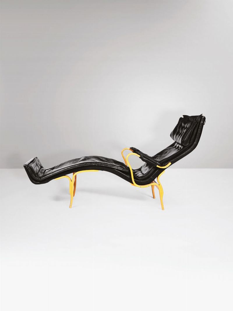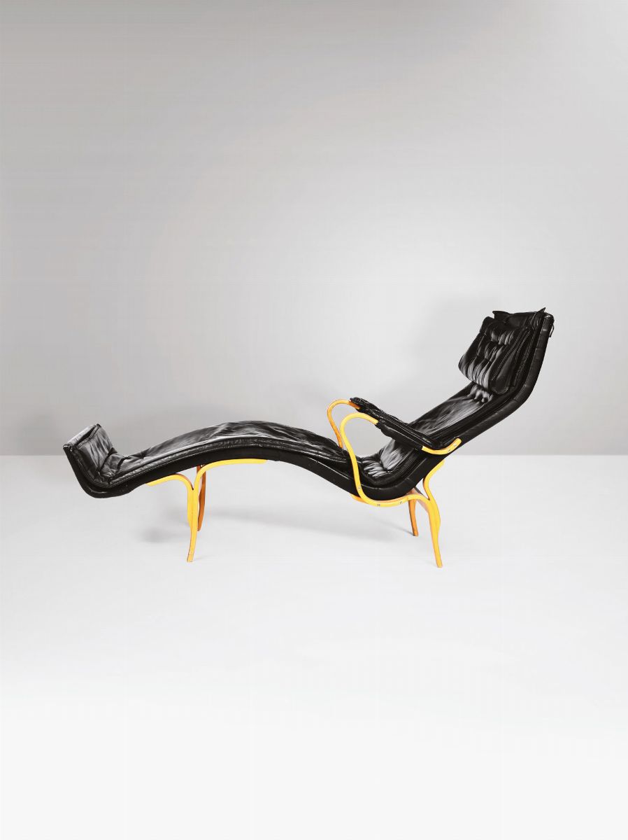 Chaise longue con struttura in legno e rivestimento in pelle.