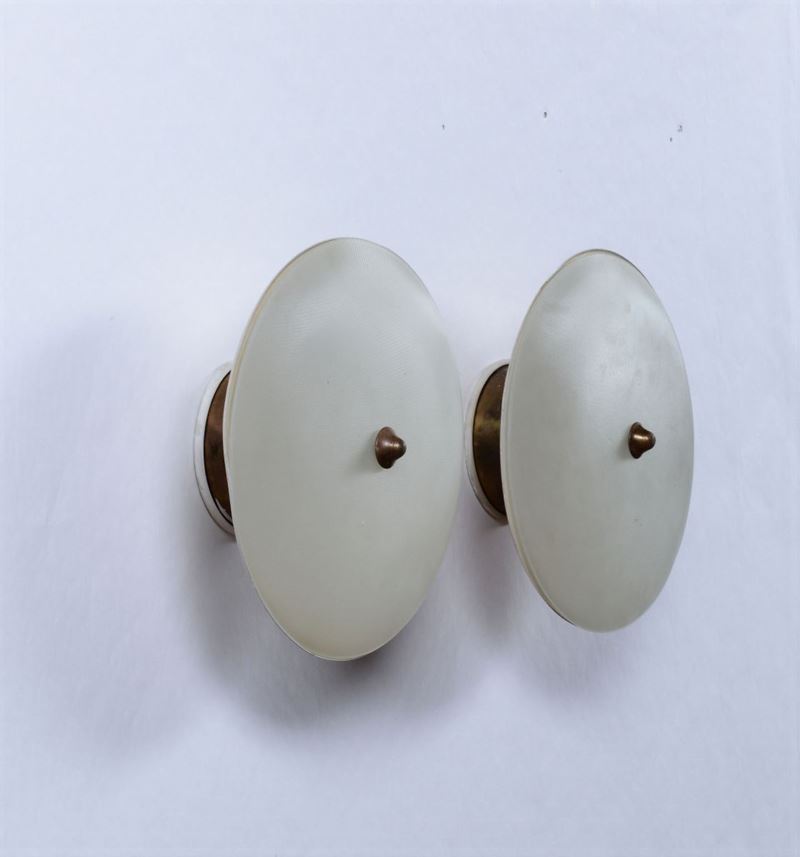 Coppia di appliques con struttura in ottone e ottone laccato. Diffusore in vetro satinato.