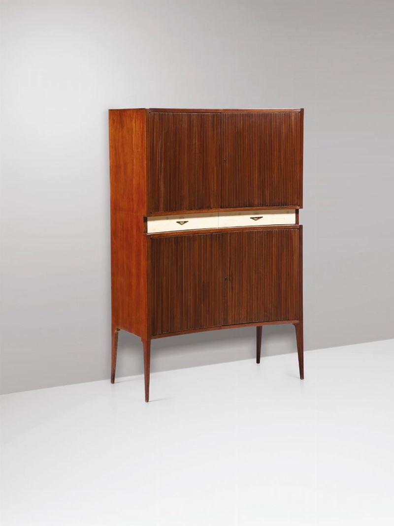 Coppia di credenze con struttura in legno e rivestimenti in legno grissinato. Dettagli in ottone.
