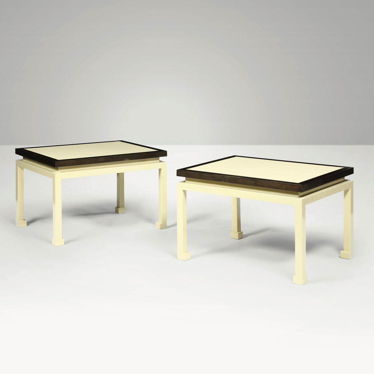 Coppia di tavoli bassi in legno laccato con profilo in ottone.