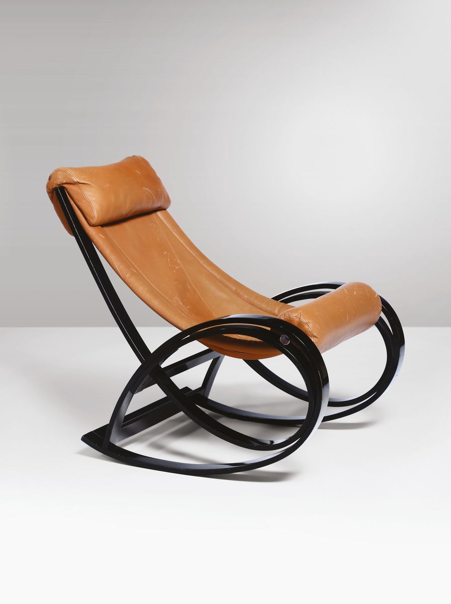 Poltrona a dondolo Sgarsul con struttura in legno curvato e seduta in pelle.
