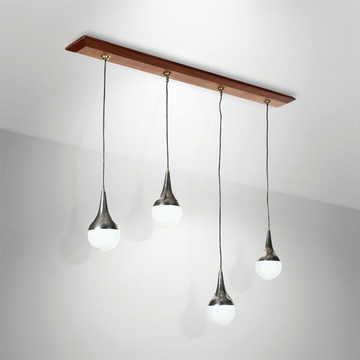 Lampada a sospensione con struttura in legno e ottone nichelato. Diffusori in vetro opalino.