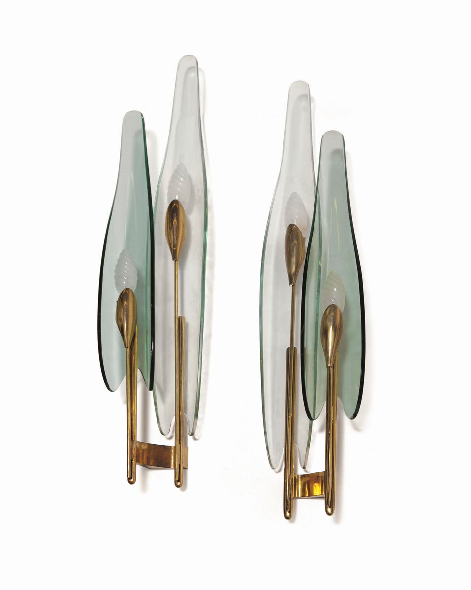 Coppia di appliques modello 1461 Dahlia con diffusori in cristallo colorato, curvato e molato. Struttura in ottone.