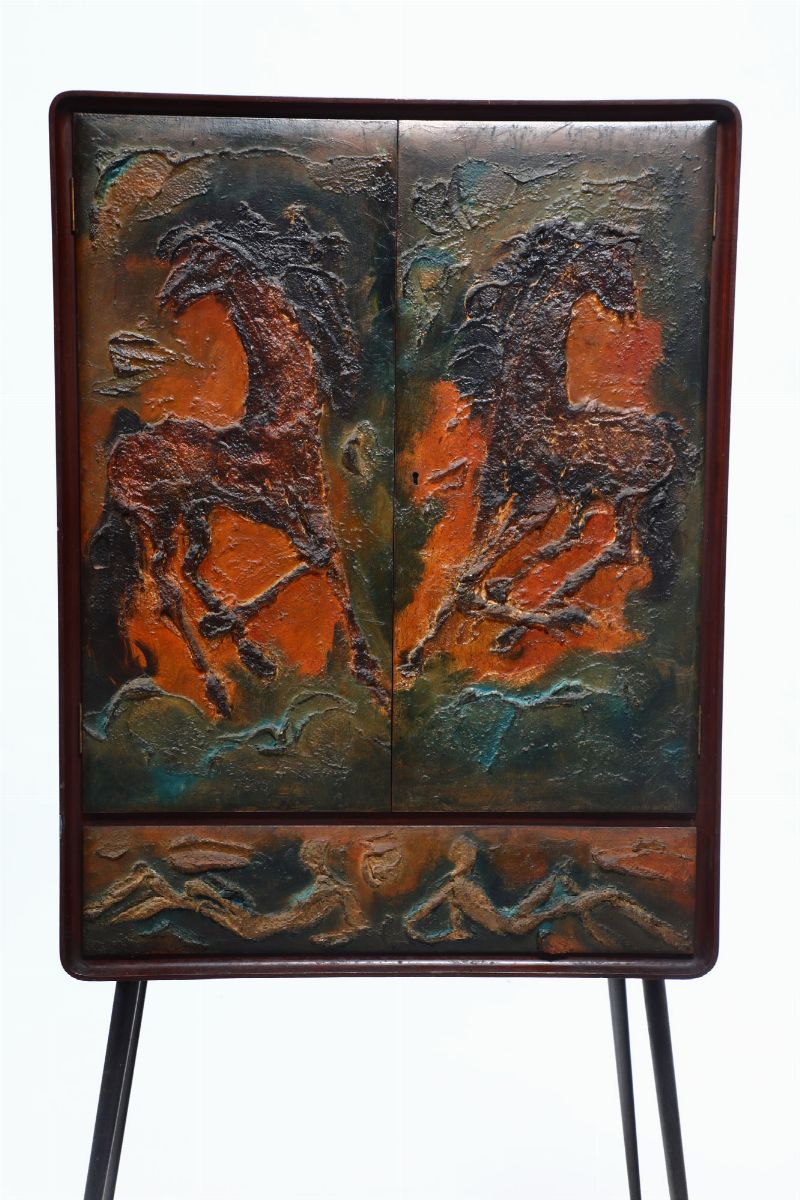 Mobile bar con struttura in legno e legno decorato. Sostegni in ottone laccato e ottone.