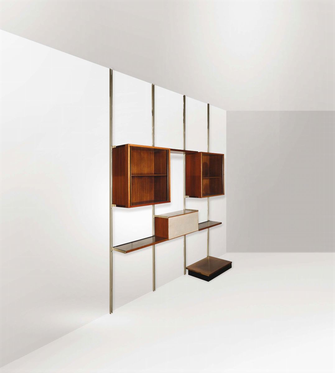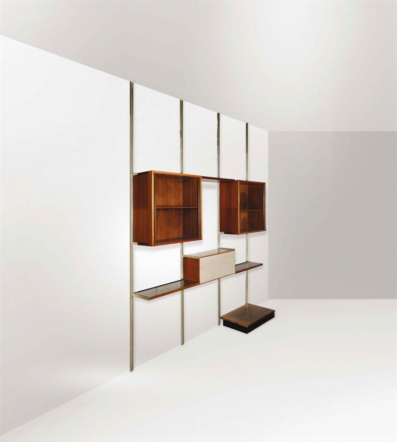 Libreria componibile E22 con struttura in legno e metallo laccato.
