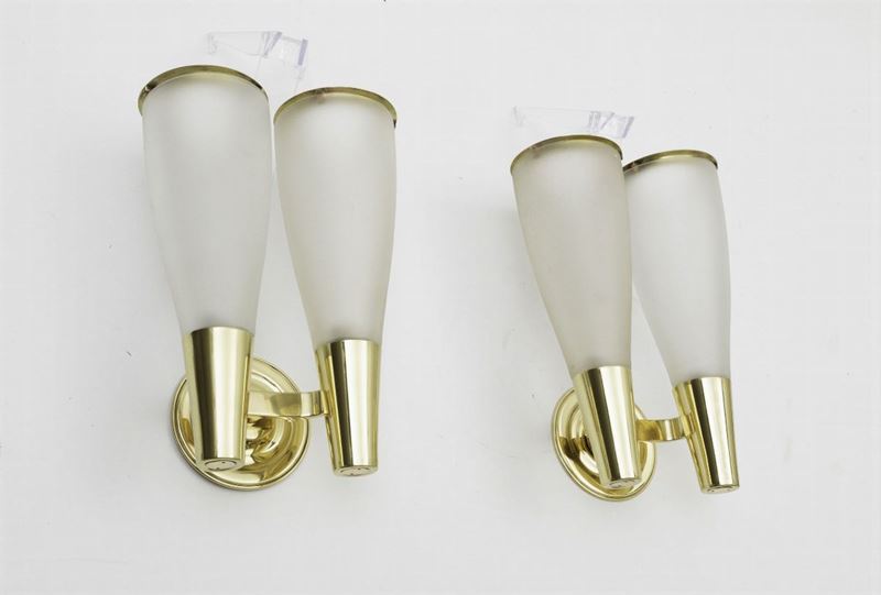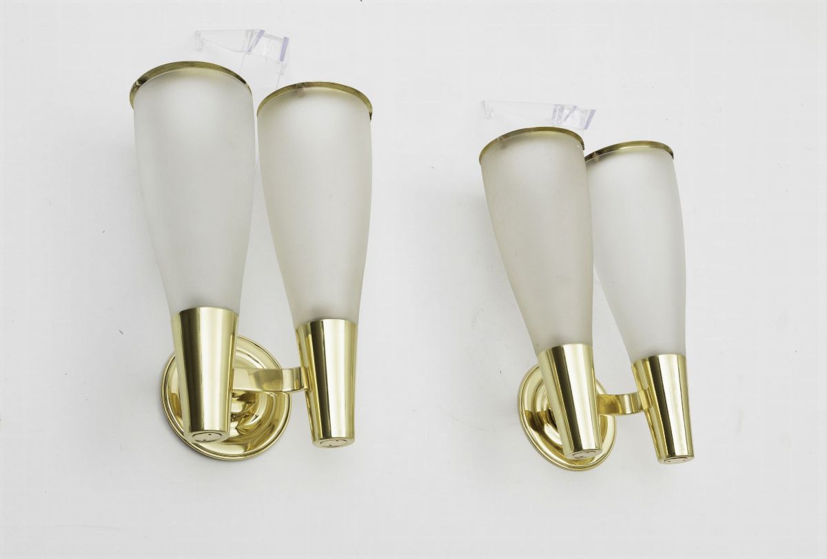 Coppia di applique mod. 1537 con struttura in ottone e doppio diffusore in vetro satinato.