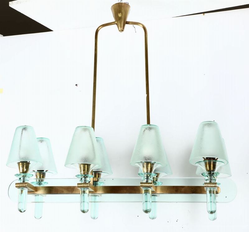 Lampada a sospensione con struttura in ottone ed elementi diffusori in vetro colorato molato. Elementi in vetro di Murano Corroso.