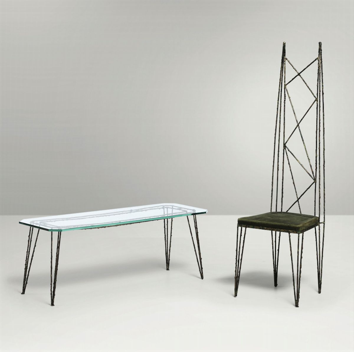 Set composto da un tavolo basso ed una sedia in ferro dorato. Piano in vetro e seduta rivestita in tessuto.
