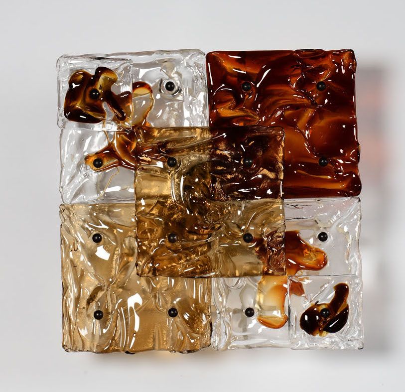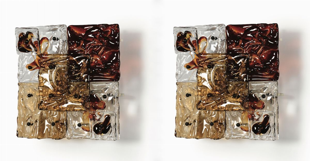Coppia di lampade da parete mod. Patchwork con struttura in metallo ed elementi diffusori in vetro di Murano.