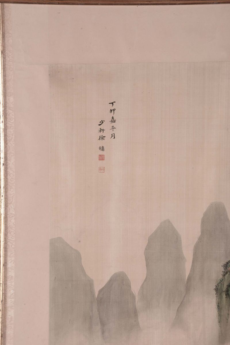 A painting on paper depicting mountain landscape with figures and inscription, China, Qing Dynasty, 19th century
