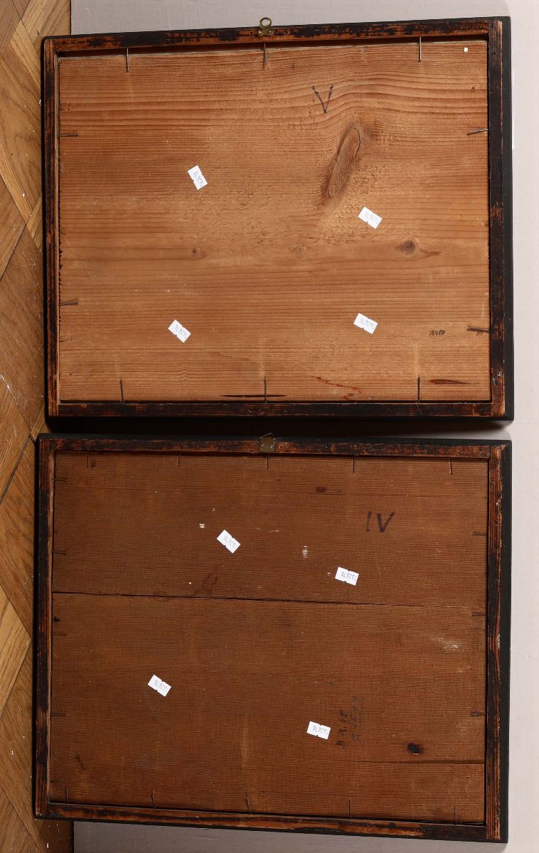 coppia di dipinti su vetro, cm 34x44