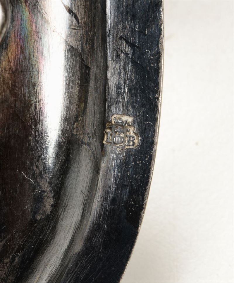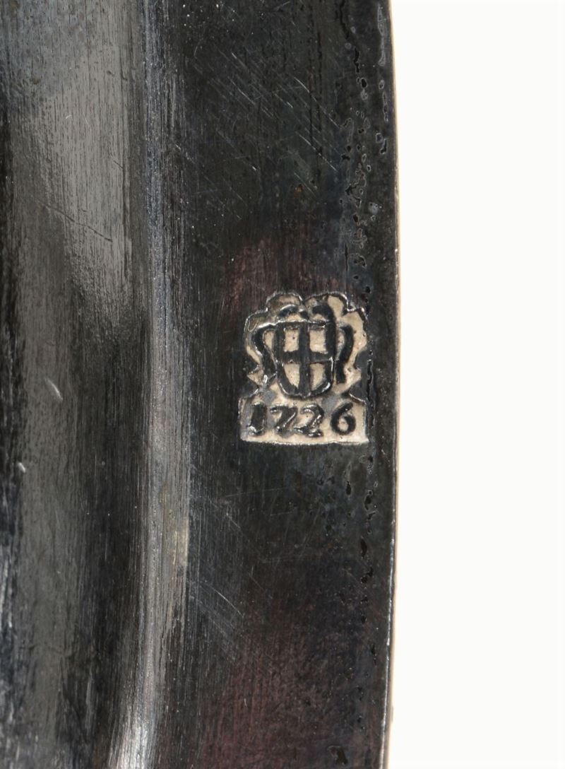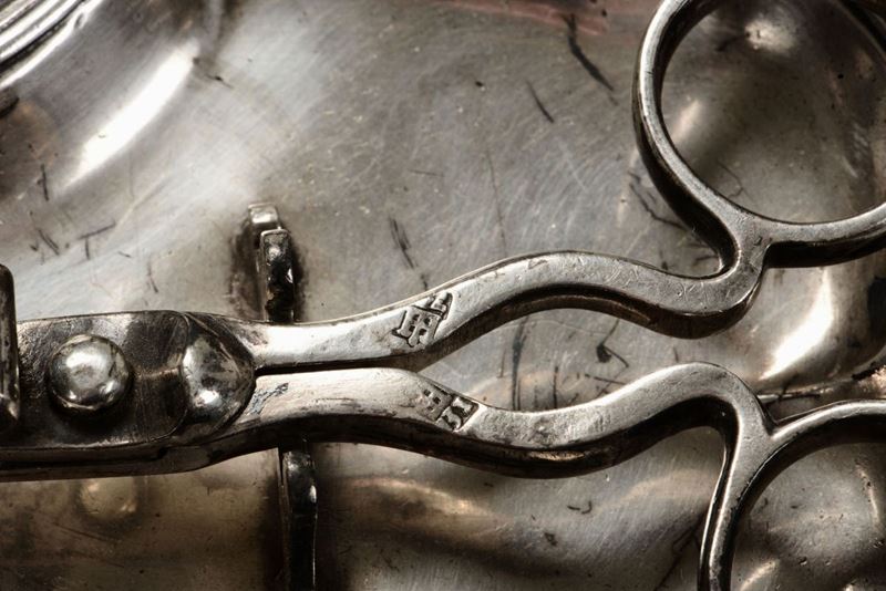 Molten, embossed and chiselled silver. Genoa, Torretta stamp for the year 1731 (on the scissor) and two unidentified marks, one with a crest and the year 1726 (on the tray)