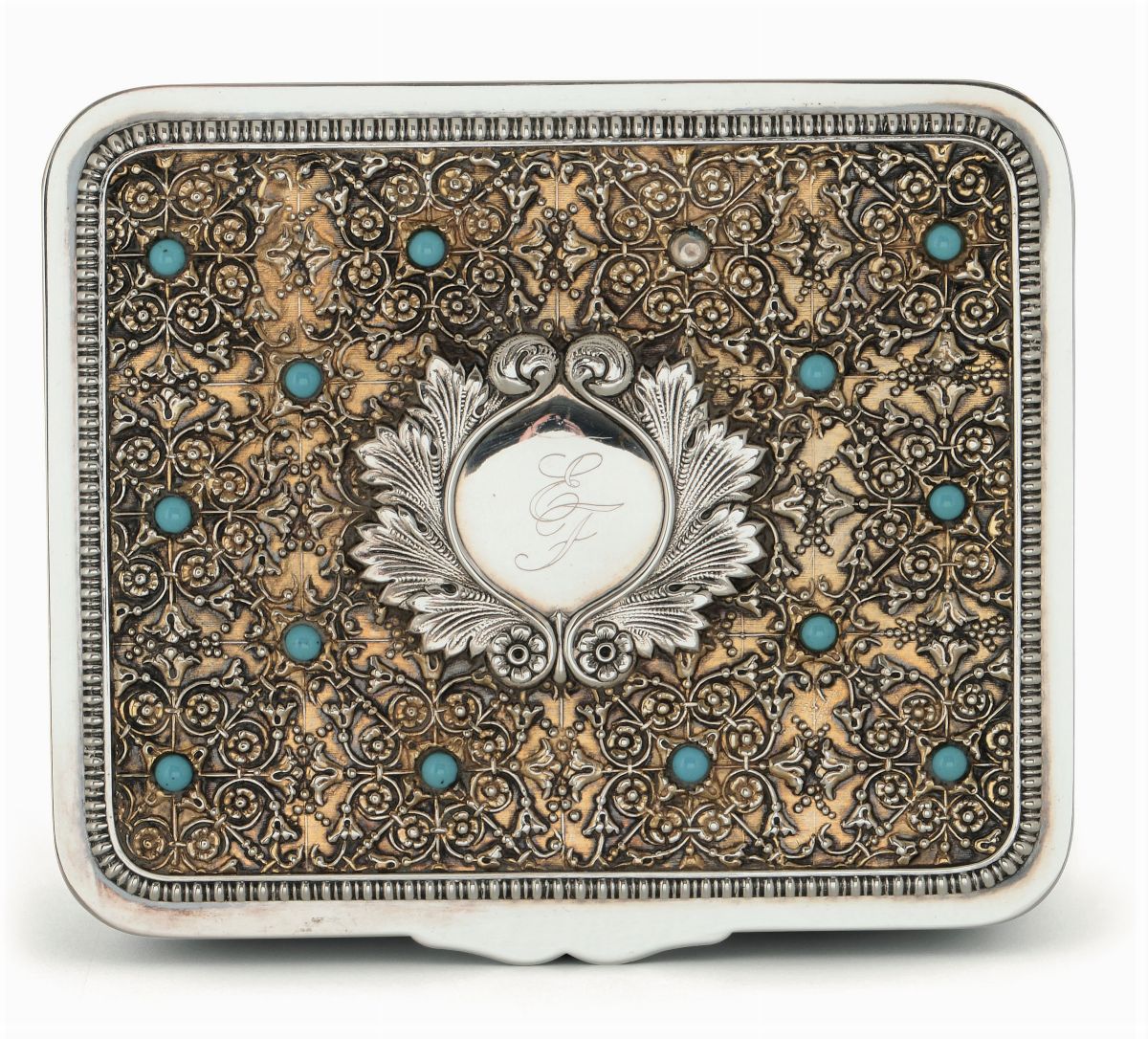 Molten, embossed, gilt and chiselled silver and turquoise cabochons. Silversmith Stefani, Bologna, second half of the 20th century