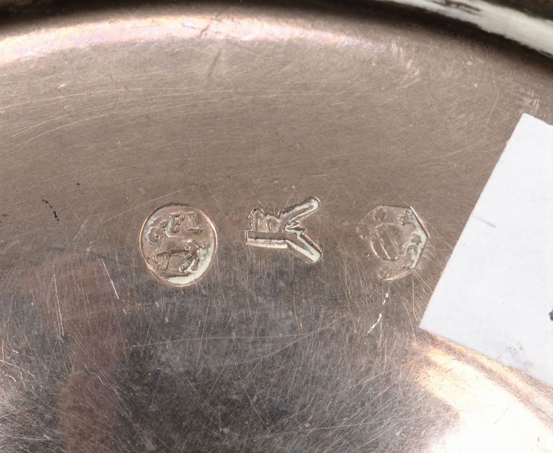 Molten, embossed and chiselled silver. Unknown goldsmith's mark and stamps for the city's Guarantee Office
