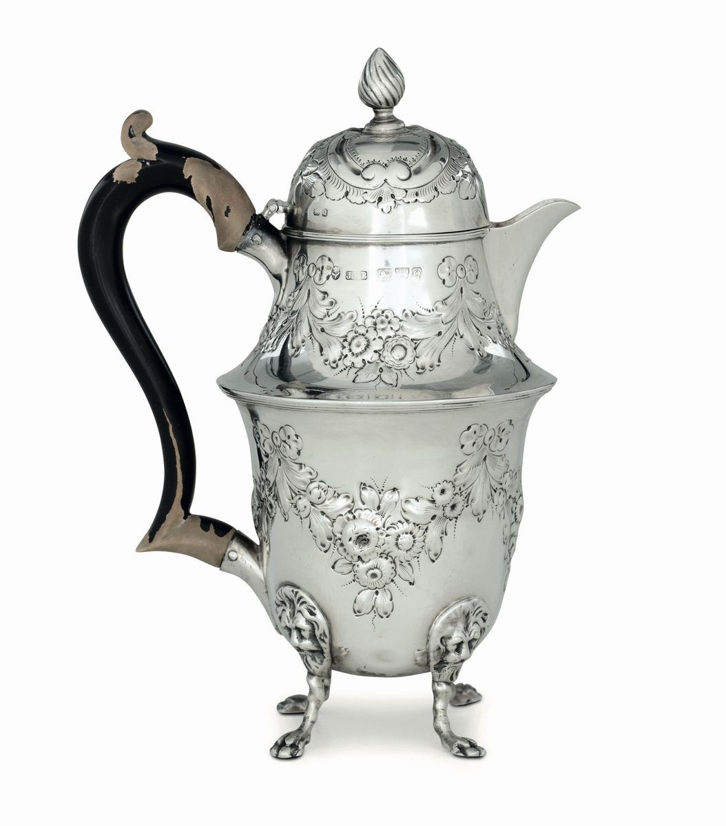 Molten, embossed and chiselled silver with an ebonised wood handle. Unidentified silversmith J.M.B.