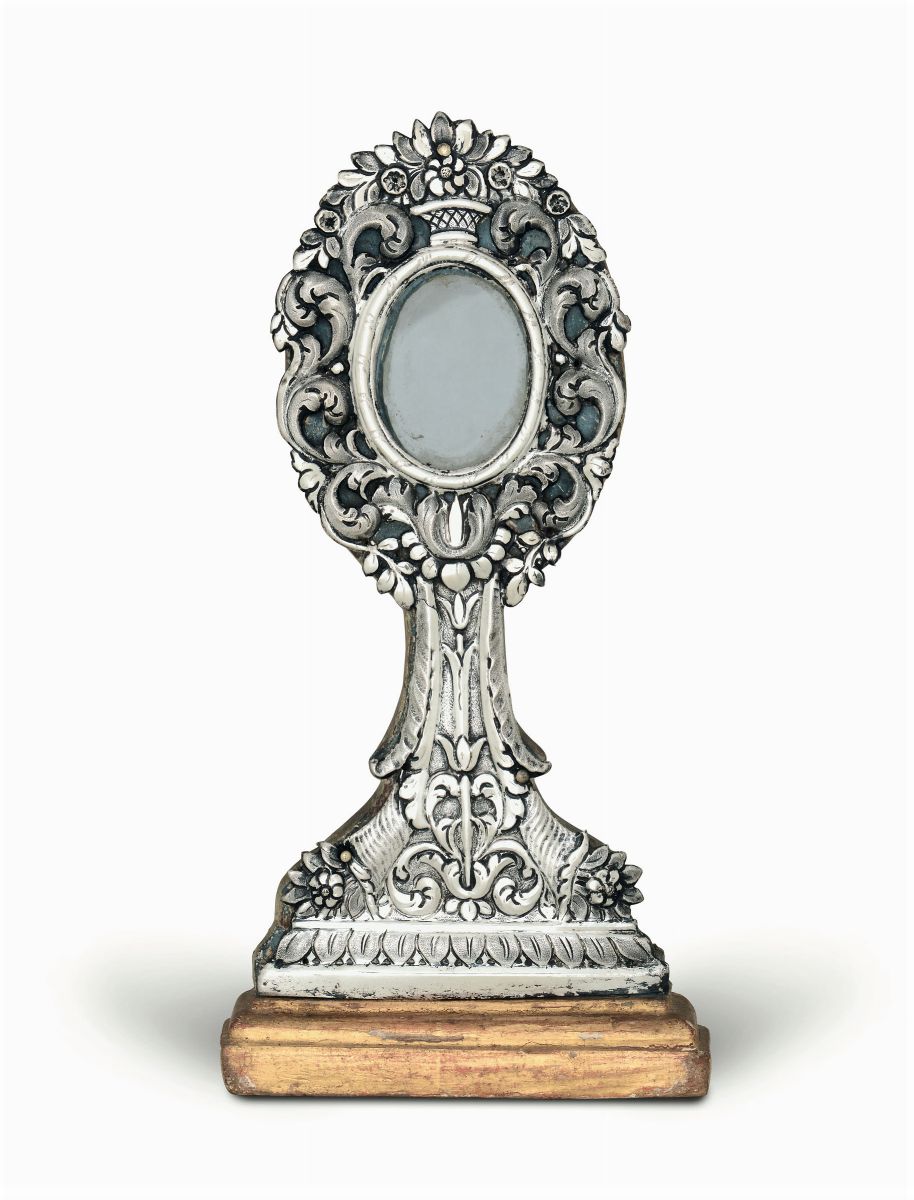 Embossed, chiselled and perforated silver and gilt wood. Apparently unmarked
