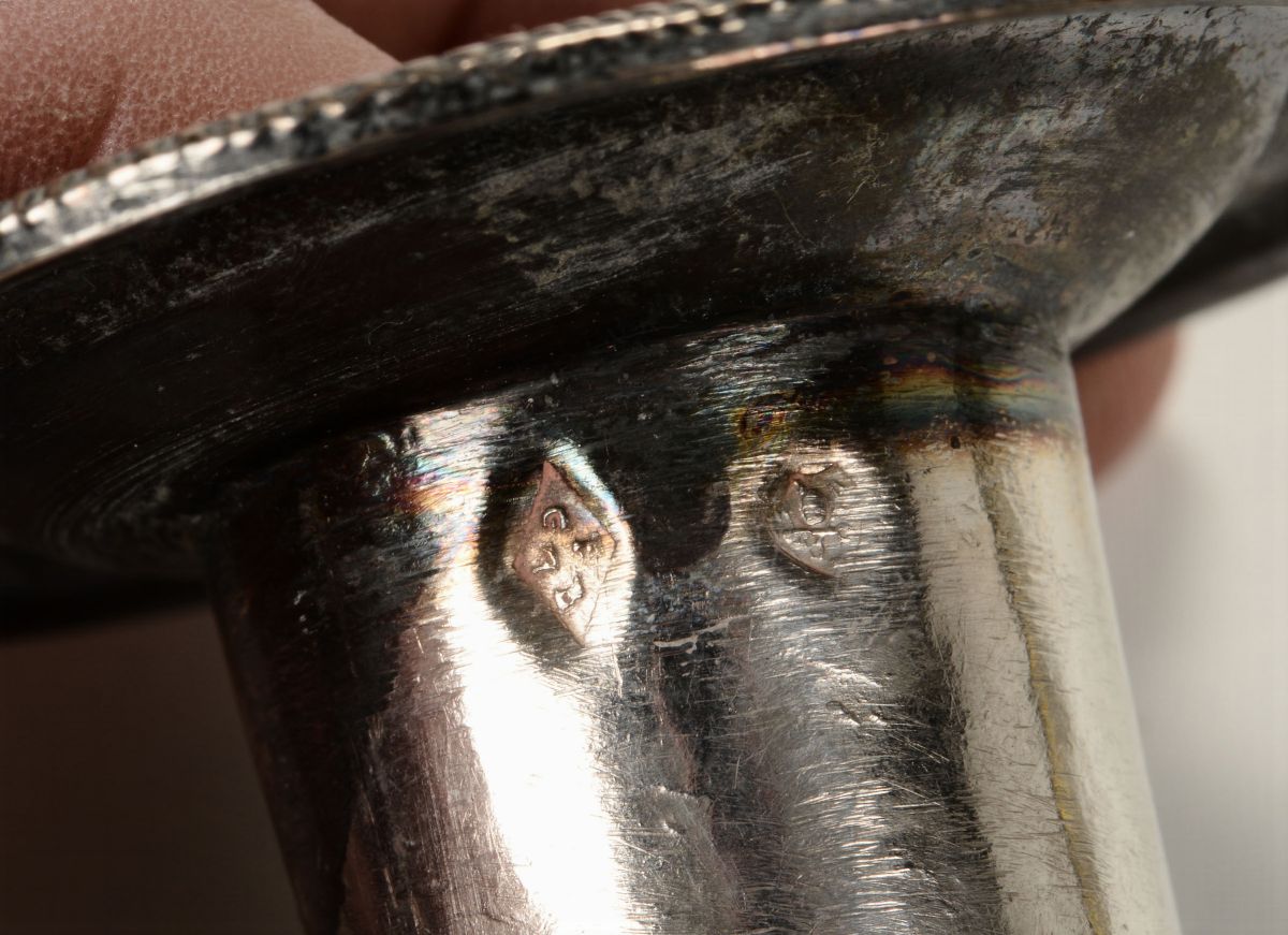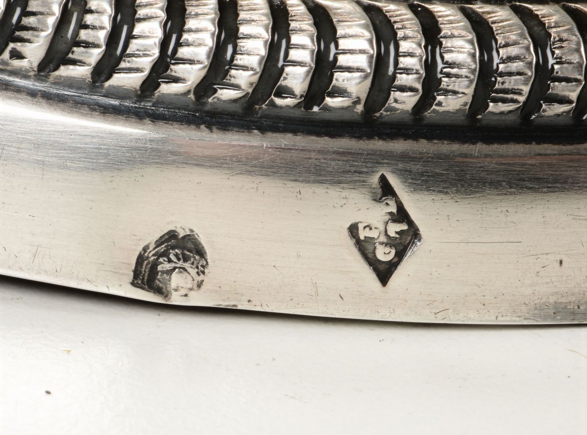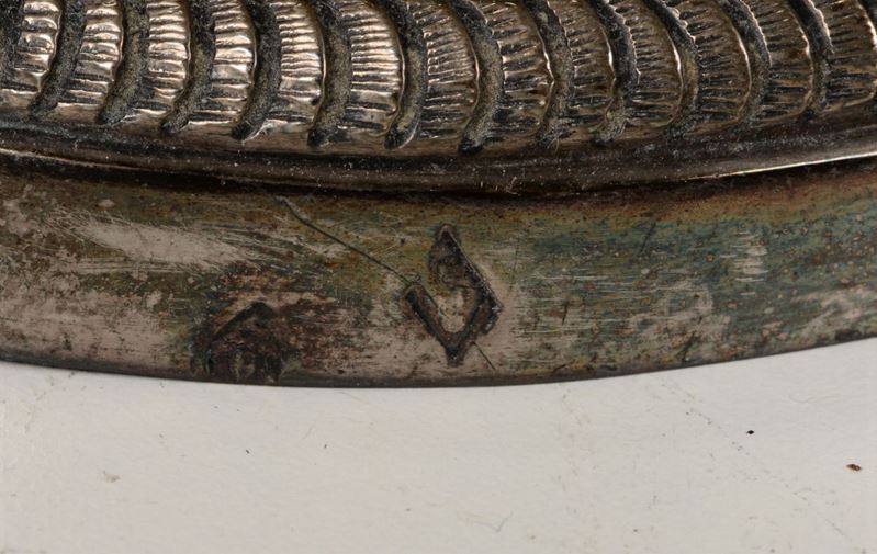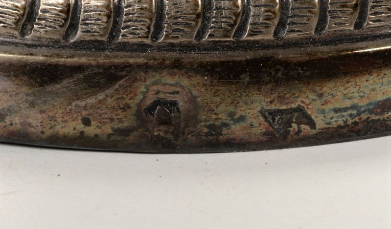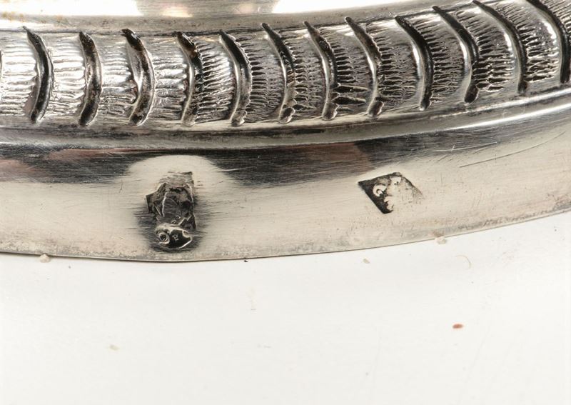 Embossed and chiselled silver. Cameral stamp (in use from 1817) and unidentified goldsmith's mark, traceable to Giuseppe II Brunelli or Giuseppe Battaglia